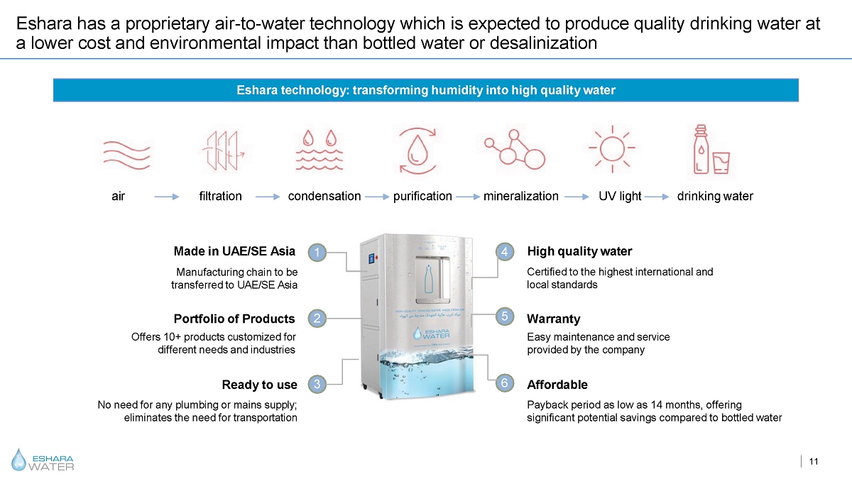 Eshara has a proprietary air - to - water technology which is expected to produce quality drinking water at a lower cost and environmental impact than bottled water or desalinization air filtration condensation purification mineralization UV light drinking water Made in UAE /SE Asia Manufacturing chain to be transferred to UAE /SE Asia Affordable Payback period as low as 14 months, offering significant potential savings compared to bottled water Ready to use No need for any plumbing or mains supply; eliminates the need for transportation Warranty Easy maintenance and service provided by the company 1 Portfolio of Products 2 Offers 10+ products customized for different needs and industries 3 5 6 4 High quality water Certified to the highest international and local standards Eshara technology: transforming humidity into high quality water 11