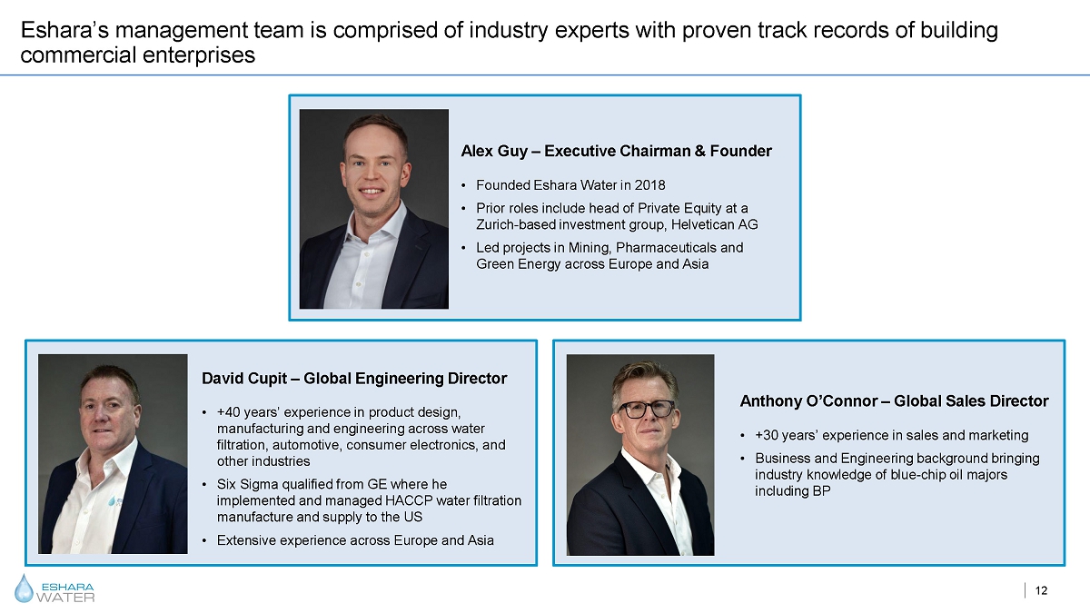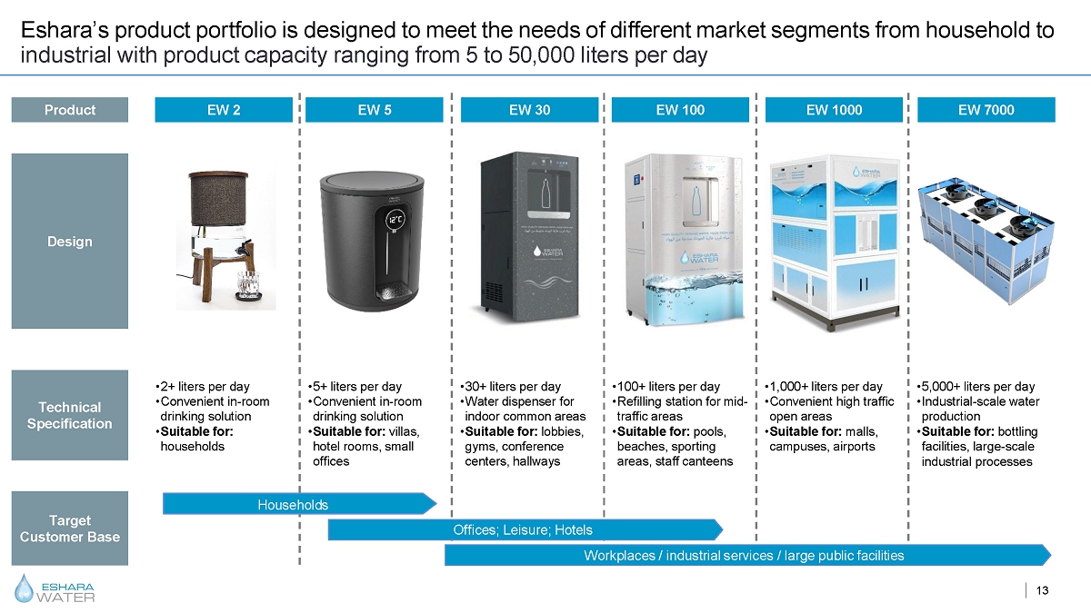 Eshara’s management team is comprised of industry experts with proven track records of building commercial enterprises 12 Alex Guy – Executive Chairman & Founder • Founded Eshara Water in 2018 • Prior roles include head of Private Equity at a Zurich - based investment group, Helvetican AG • Led projects in Mining, Pharmaceuticals and Green Energy across Europe and Asia David Cupit – Global Engineering Director • +40 years’ experience in product design, manufacturing and engineering across water filtration, automotive, consumer electronics, and other industries • Six Sigma qualified from GE where he implemented and managed HACCP water filtration manufacture and supply to the US • Extensive experience across Europe and Asia Anthony O’Connor – Global Sales Director • +30 years’ experience in sales and marketing • Business and Engineering background bringing industry knowledge of blue - chip oil majors including BP