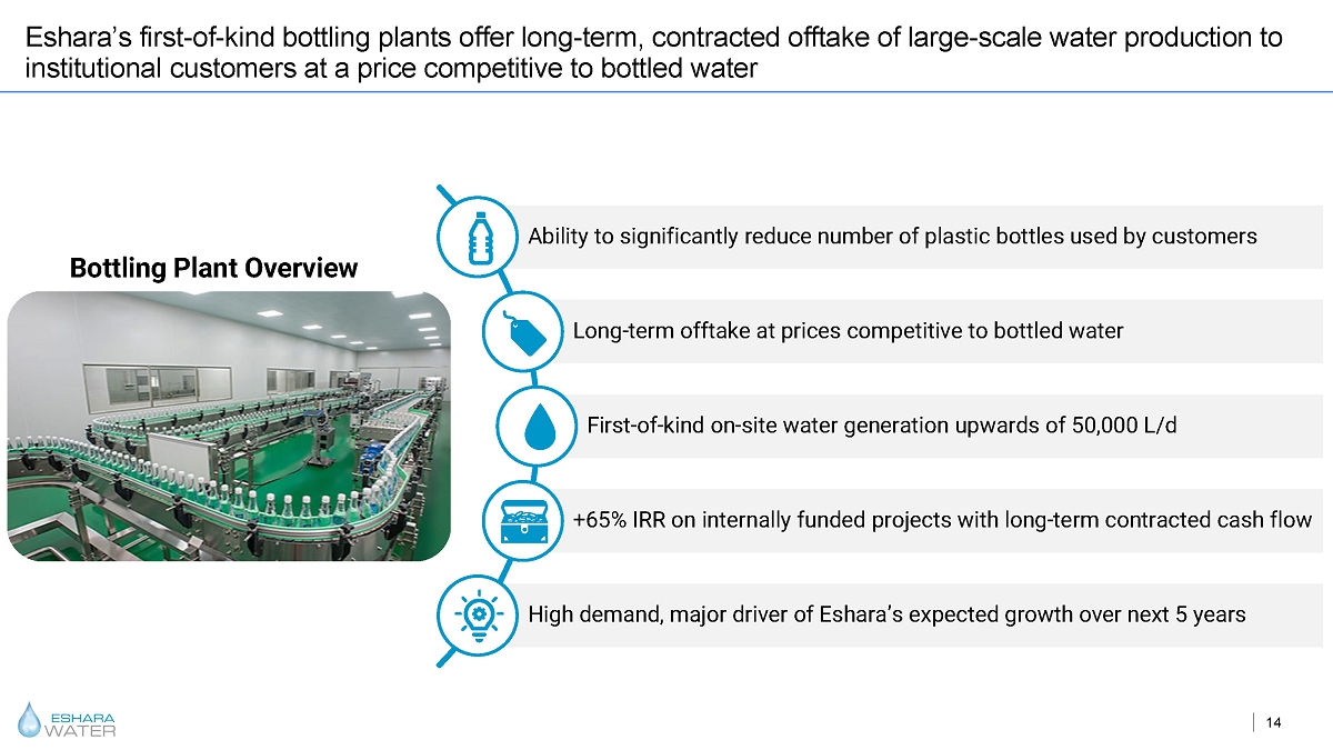 Eshara’s first - of - kind bottling plants offer long - term, contracted offtake of large - scale water production to institutional customers at a price competitive to bottled water 14 Ability to significantly reduce number of plastic bottles used by customers Long - term offtake at prices competitive to bottled water First - of - kind on - site water generation upwards of 50,000 L/d +65% IRR on internally funded projects with long - term contracted cash flow High demand, major driver of Eshara’s expected growth over next 5 years Bottling Plant Overview