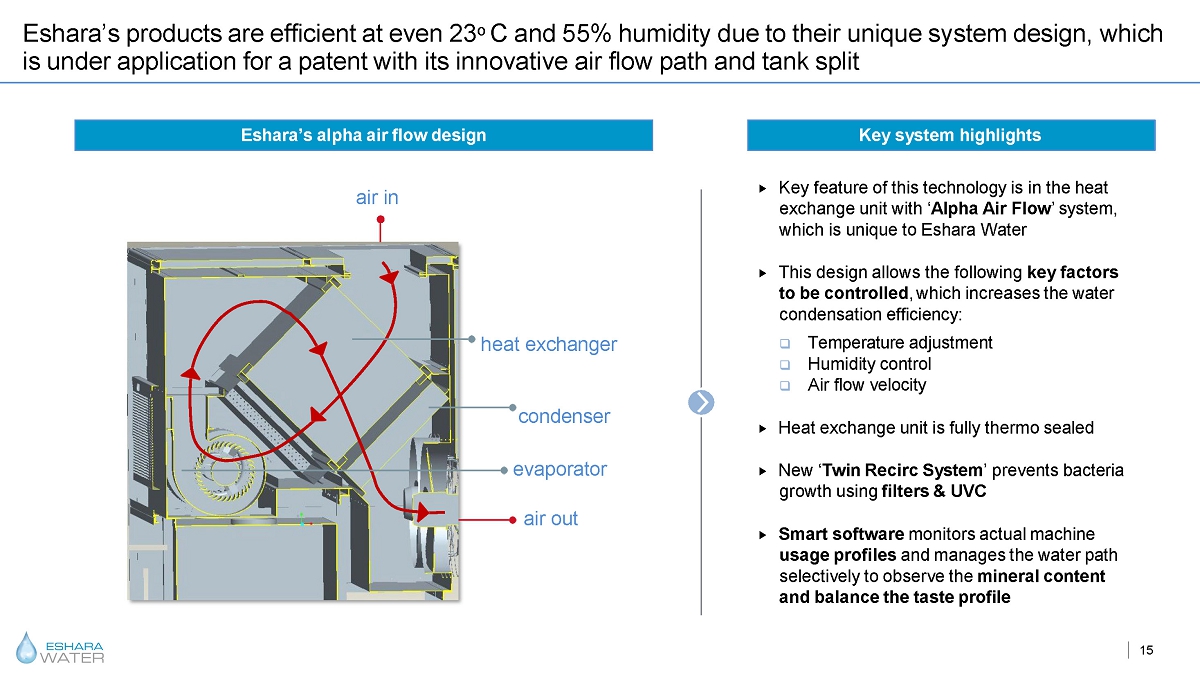Eshara’s products are efficient at even 23 o C and 55% humidity due to their unique system design, which is under application for a patent with its innovative air flow path and tank split air in heat exchanger condenser evaporator air out  Key feature of this technology is in the heat exchange unit with ‘ Alpha Air Flow ’ system, which is unique to Eshara Water  This design allows the following key factors to be controlled , which increases the water condensation efficiency: □ Temperature adjustment □ Humidity control □ Air flow velocity  Heat exchange unit is fully thermo sealed  New ‘ Twin Recirc System ’ prevents bacteria growth using filters & UVC  Smart software monitors actual machine usage profiles and manages the water path selectively to observe the mineral content and balance the taste profile Key system highlights Eshara’s alpha air flow design 15