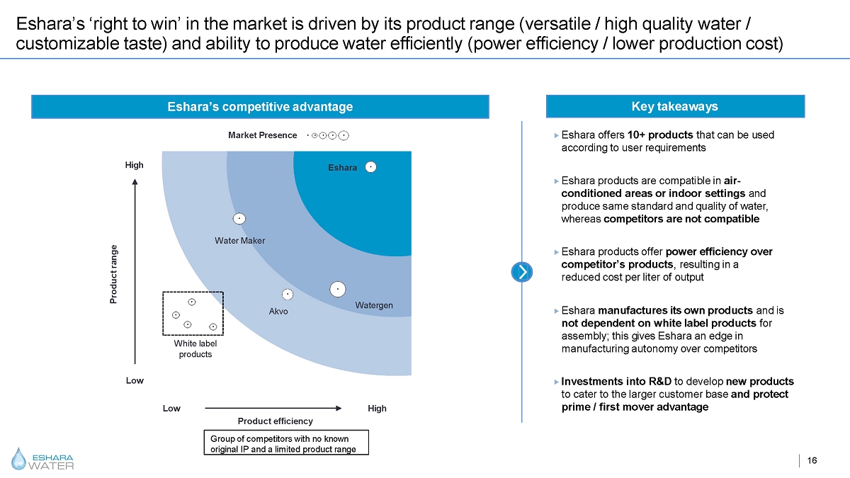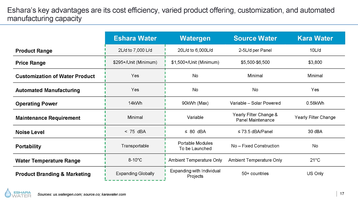 Eshara’s ‘right to win’ in the market is driven by its product range (versatile / high quality water / customizable taste) and ability to produce water efficiently (power efficiency / lower production cost) Eshara’s competitive advantage Key takeaways  Eshara offers 10+ products that can be used according to user requirements  Eshara products are compatible in air - conditioned areas or indoor settings and produce same standard and quality of water , whereas competitors are not compatible  Eshara products offer power efficiency over competitor’s products , resulting in a reduced cost per lite r of output  Eshara manufactures its own products and is not dependent on white label products for assembly; this gives Eshara an edge in manufacturing autonomy over competitors  Investments into R&D to develop new products to cater to the larger customer base and protect prime / first mover advantage Group of competitors with no known original IP and a limited product range     High Low Low High Eshara Watergen W ater M aker Akvo      Market Presence Product range Product efficiency     White label products 16 