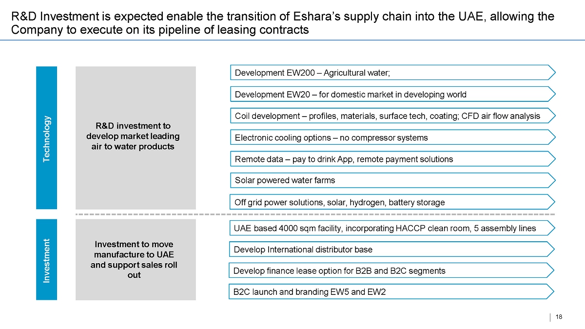 R&D Investment is expected enable the transition of Eshara’s supply chain into the UAE, allowing the Company to execute on its pipeline of leasing contracts Development EW200 – Agricultural water; Development EW20 – for domestic market in developing world Coil development – profiles, materials, surface tech, coating; CFD air flow analysis Off grid power solutions, solar, hydrogen, battery storage Remote data – pay to drink App, remote payment solutions Solar powered water farms Electronic cooling options – no compressor systems Technology R&D investment to develop market leading air to water products Investment Develop International distributor base Develop finance lease option for B2B and B2C segments Investment to move manufacture to UAE and support sales roll out 18 UAE based 4000 sqm facility, incorporating HACCP clean room, 5 assembly lines B2C launch and branding EW5 and EW2