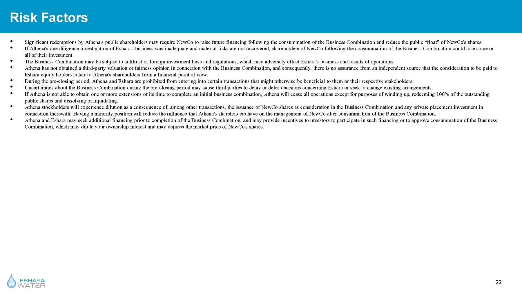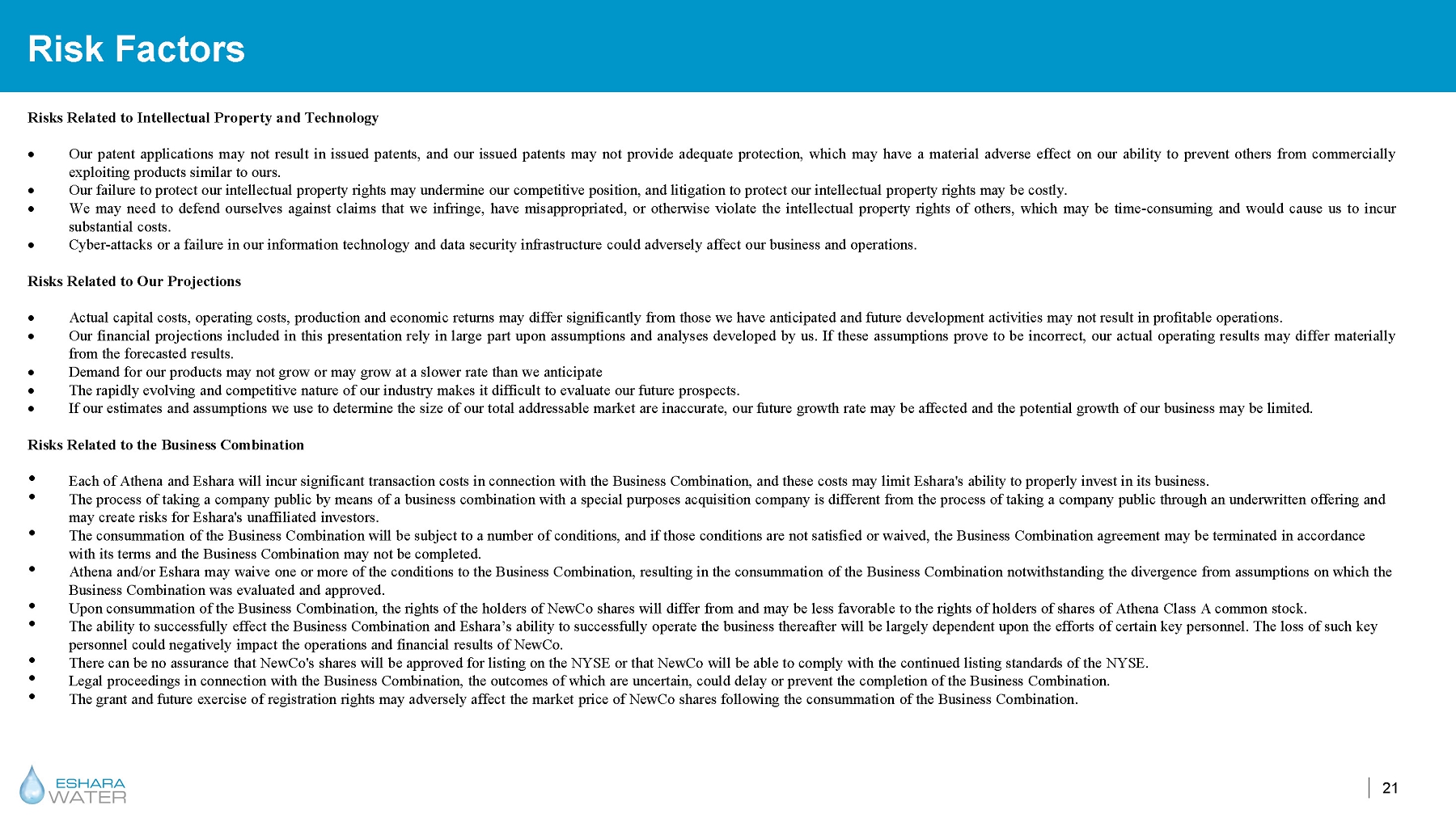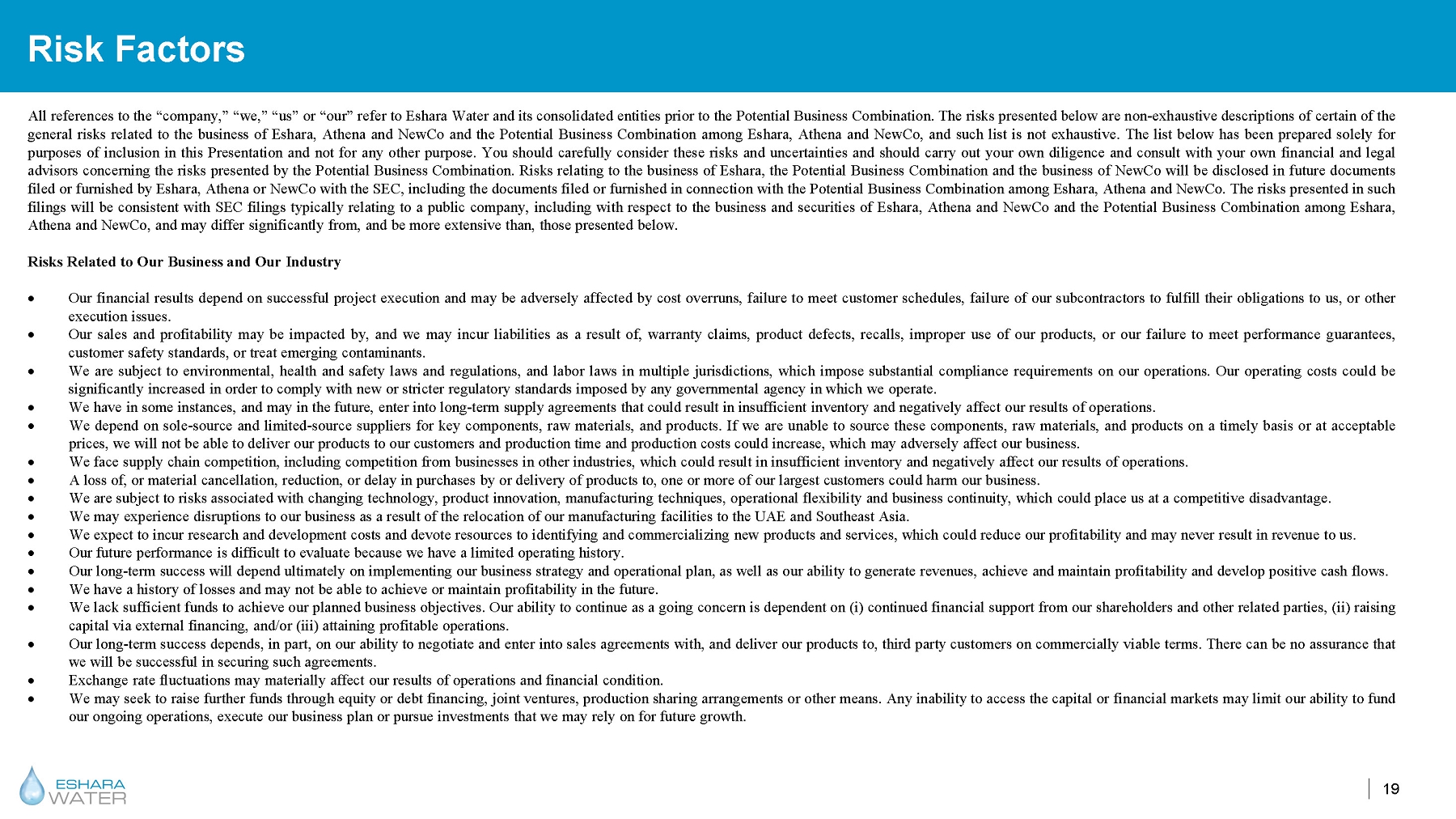 19 Risk Factors All references to the “company,” “we,” “us” or “our” refer to Eshara Water and its consolidated entities prior to the Potential Business Combination . The risks presented below are non - exhaustive descriptions of certain of the general risks related to the business of Eshara , Athena and NewCo and the Potential Business Combination among Eshara , Athena and NewCo, and such list is not exhaustive . The list below has been prepared solely for purposes of inclusion in this Presentation and not for any other purpose . You should carefully consider these risks and uncertainties and should carry out your own diligence and consult with your own financial and legal advisors concerning the risks presented by the Potential Business Combination . Risks relating to the business of Eshara , the Potential Business Combination and the business of NewCo will be disclosed in future documents filed or furnished by Eshara , Athena or NewCo with the SEC, including the documents filed or furnished in connection with the Potential Business Combination among Eshara , Athena and NewCo . The risks presented in such filings will be consistent with SEC filings typically relating to a public company, including with respect to the business and securities of Eshara , Athena and NewCo and the Potential Business Combination among Eshara , Athena and NewCo, and may differ significantly from, and be more extensive than, those presented below . Risks Related to Our Business and Our Industry  Our financial results depend on successful project execution and may be adversely affected by cost overruns, failure to meet customer schedules, failure of our subcontractors to fulfill their obligations to us, or other execution issues .  Our sales and profitability may be impacted by, and we may incur liabilities as a result of, warranty claims, product defects, recalls, improper use of our products, or our failure to meet performance guarantees, customer safety standards, or treat emerging contaminants .  We are subject to environmental, health and safety laws and regulations, and labor laws in multiple jurisdictions, which impose substantial compliance requirements on our operations . Our operating costs could be significantly increased in order to comply with new or stricter regulatory standards imposed by any governmental agency in which we operate .  We have in some instances, and may in the future, enter into long - term supply agreements that could result in insufficient inventory and negatively affect our results of operations .  We depend on sole - source and limited - source suppliers for key components, raw materials, and products . If we are unable to source these components, raw materials, and products on a timely basis or at acceptable prices, we will not be able to deliver our products to our customers and production time and production costs could increase, which may adversely affect our business .  We face supply chain competition, including competition from businesses in other industries, which could result in insufficient inventory and negatively affect our results of operations .  A loss of, or material cancellation, reduction, or delay in purchases by or delivery of products to, one or more of our largest customers could harm our business .  We are subject to risks associated with changing technology, product innovation, manufacturing techniques, operational flexibility and business continuity, which could place us at a competitive disadvantage .  We may experience disruptions to our business as a result of the relocation of our manufacturing facilities to the UAE and Southeast Asia .  We expect to incur research and development costs and devote resources to identifying and commercializing new products and services, which could reduce our profitability and may never result in revenue to us .  Our future performance is difficult to evaluate because we have a limited operating history .  Our long - term success will depend ultimately on implementing our business strategy and operational plan, as well as our ability to generate revenues, achieve and maintain profitability and develop positive cash flows .  We have a history of losses and may not be able to achieve or maintain profitability in the future .  We lack sufficient funds to achieve our planned business objectives . Our ability to continue as a going concern is dependent on ( i ) continued financial support from our shareholders and other related parties, (ii) raising capital via external financing, and/or (iii) attaining profitable operations .  Our long - term success depends, in part, on our ability to negotiate and enter into sales agreements with, and deliver our products to, third party customers on commercially viable terms . There can be no assurance that we will be successful in securing such agreements .  Exchange rate fluctuations may materially affect our results of operations and financial condition .  We may seek to raise further funds through equity or debt financing, joint ventures, production sharing arrangements or other means . Any inability to access the capital or financial markets may limit our ability to fund our ongoing operations, execute our business plan or pursue investments that we may rely on for future growth .