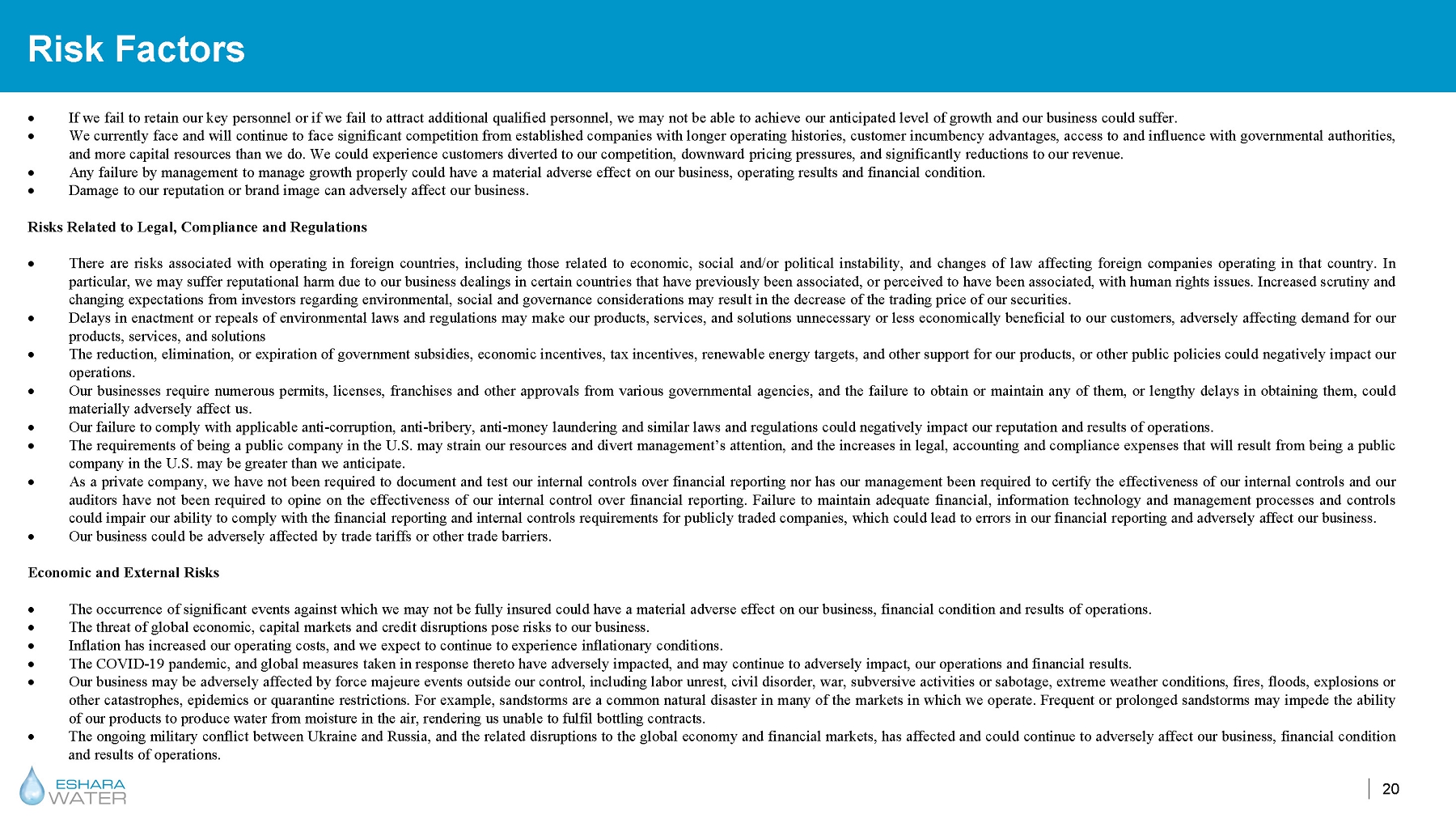 20 Risk Factors  If we fail to retain our key personnel or if we fail to attract additional qualified personnel, we may not be able to achieve our anticipated level of growth and our business could suffer .  We currently face and will continue to face significant competition from established companies with longer operating histories, customer incumbency advantages, access to and influence with governmental authorities, and more capital resources than we do . We could experience customers diverted to our competition, downward pricing pressures, and significantly reductions to our revenue .  Any failure by management to manage growth properly could have a material adverse effect on our business, operating results and financial condition .  Damage to our reputation or brand image can adversely affect our business . Risks Related to Legal, Compliance and Regulations  There are risks associated with operating in foreign countries, including those related to economic, social and/or political instability, and changes of law affecting foreign companies operating in that country . In particular, we may suffer reputational harm due to our business dealings in certain countries that have previously been associated, or perceived to have been associated, with human rights issues . Increased scrutiny and changing expectations from investors regarding environmental, social and governance considerations may result in the decrease of the trading price of our securities .  Delays in enactment or repeals of environmental laws and regulations may make our products, services, and solutions unnecessary or less economically beneficial to our customers, adversely affecting demand for our products, services, and solutions  The reduction, elimination, or expiration of government subsidies, economic incentives, tax incentives, renewable energy targets, and other support for our products, or other public policies could negatively impact our operations .  Our businesses require numerous permits, licenses, franchises and other approvals from various governmental agencies, and the failure to obtain or maintain any of them, or lengthy delays in obtaining them, could materially adversely affect us .  Our failure to comply with applicable anti - corruption, anti - bribery, anti - money laundering and similar laws and regulations could negatively impact our reputation and results of operations .  The requirements of being a public company in the U . S . may strain our resources and divert management’s attention, and the increases in legal, accounting and compliance expenses that will result from being a public company in the U . S . may be greater than we anticipate .  As a private company, we have not been required to document and test our internal controls over financial reporting nor has our management been required to certify the effectiveness of our internal controls and our auditors have not been required to opine on the effectiveness of our internal control over financial reporting . Failure to maintain adequate financial, information technology and management processes and controls could impair our ability to comply with the financial reporting and internal controls requirements for publicly traded companies, which could lead to errors in our financial reporting and adversely affect our business .  Our business could be adversely affected by trade tariffs or other trade barriers . Economic and External Risks  The occurrence of significant events against which we may not be fully insured could have a material adverse effect on our business, financial condition and results of operations .  The threat of global economic, capital markets and credit disruptions pose risks to our business .  Inflation has increased our operating costs, and we expect to continue to experience inflationary conditions .  The COVID - 19 pandemic, and global measures taken in response thereto have adversely impacted, and may continue to adversely impact, our operations and financial results .  Our business may be adversely affected by force majeure events outside our control, including labor unrest, civil disorder, war, subversive activities or sabotage, extreme weather conditions, fires, floods, explosions or other catastrophes, epidemics or quarantine restrictions . For example, sandstorms are a common natural disaster in many of the markets in which we operate . Frequent or prolonged sandstorms may impede the ability of our products to produce water from moisture in the air, rendering us unable to fulfil bottling contracts .  The ongoing military conflict between Ukraine and Russia, and the related disruptions to the global economy and financial markets, has affected and could continue to adversely affect our business, financial condition and results of operations .