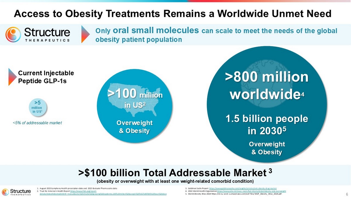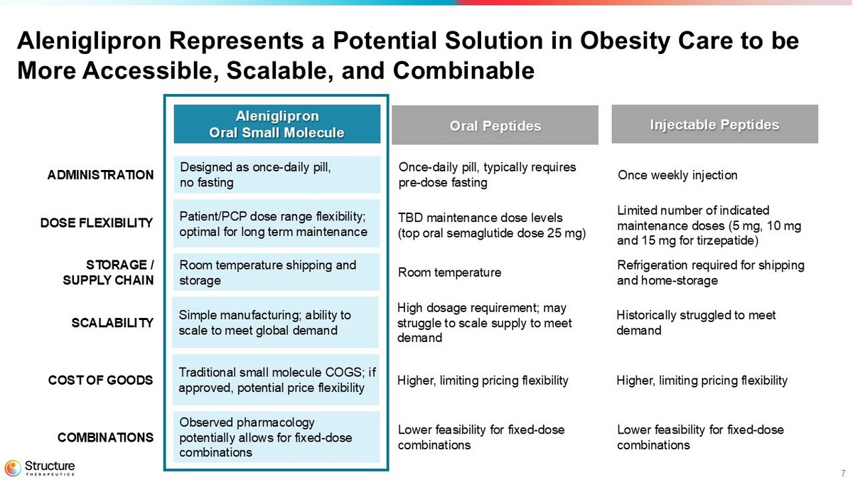 6 1. August 2025 Symphony Health prescription data and 2025 Evaluate Pharma sales data 2. Trust for America’s Health Report https://www.tfah.org/report - details/stateofobesity2019/#:~:text=Obesity%20is%20a%20growing%20epidemic,100%20million%20people%20%E2%80%93%20have%20obes 3. Goldman Sachs Report https://www.goldmansachs.com/insights/articles/anti - obesity - drug - market 4. 2022 World Health Organization https://www.who.int/news - room/fact - sheets/detail/obesity - and - overweight 5. World Obesity Atlas 2024 https://s3 - eu - west - 1.amazonaws.com/wof - files/WOF_Obesity_Atlas_2024.pdf >5 million in US 1 1.5 billion people in 2030 5 >$100 billion Total Addressable Market 3 (obesity or overweight with at least one weight - related comorbid condition) >800 million worldwide 4 >100 million in US 2 Overweight & Obesity Current Injectable Peptide GLP - 1s <5% of addressable market Access to Obesity Treatments Remains a Worldwide Unmet Need Only oral small molecules can scale to meet the needs of the global obesity patient population Overweight & Obesity