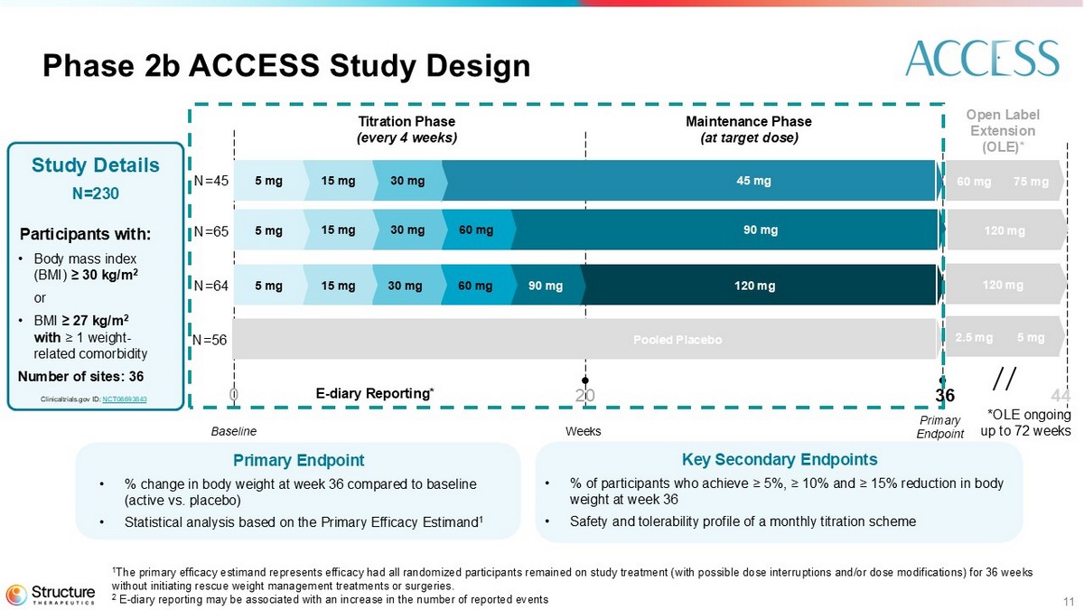 10 Multiple Aleniglipron Studies to Answer Key Questions Phase 2b ACCESS □ Assess Efficacy Tolerability, Safety up to 120 mg at 36 weeks Phase 3 Ready Chronic Weight Management ACCESS Open Label Extension Interim analysis to evaluate efficacy of 120mg up to 44 weeks Exploratory ACCESS II Evaluate efficacy at higher doses up to 180 mg and 240 mg Body Composition & Open Label Extension Evaluate tolerability with 2.5 mg starting dose Core Focus Key Questions Supplementary Studies Is there weight loss plateau beyond 36 weeks? Can we dose higher than 120 mg? Will lower 2.5 mg starting dose further improve tolerability?
