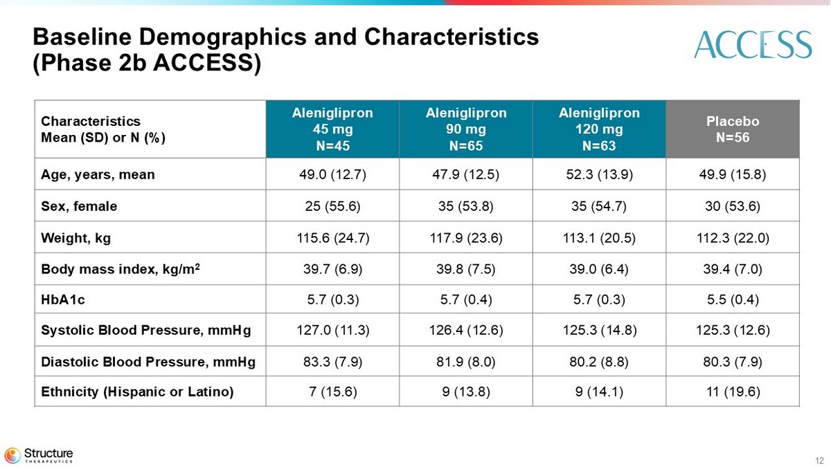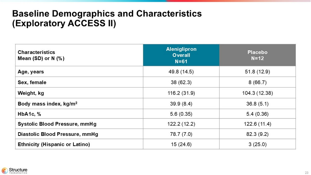 23 Placebo N=12 Aleniglipron Overall N=61 Characteristics Mean (SD) or N (%) 51.8 (12.9) 49.8 (14.5) Age, years 8 (66.7) 38 (62.3) Sex, female 104.3 (12.38) 116.2 (31.9) Weight, kg 36.8 (5.1) 39.9 (8.4) Body mass index, kg/m 2 5.4 (0.36) 5.6 (0.35) HbA1c, % 122.6 (11.4) 122.2 (12.2) Systolic Blood Pressure, mmHg 82.3 (9.2) 78.7 (7.0) Diastolic Blood Pressure, mmHg 3 (25.0) 15 (24.6) Ethnicity (Hispanic or Latino) Baseline Demographics and Characteristics (Exploratory ACCESS II)