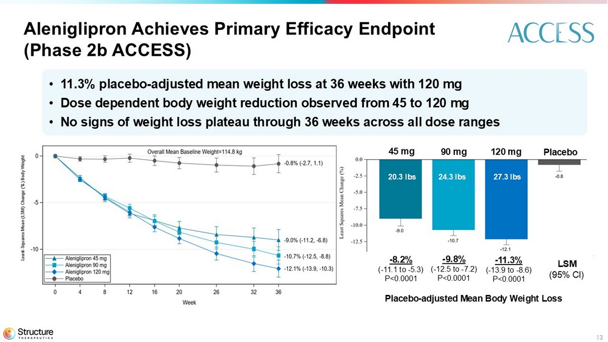12 Baseline Demographics and Characteristics (Phase 2b ACCESS) Placebo N=56 Aleniglipron 120 mg N=63 Aleniglipron 90 mg N=65 Aleniglipron 45 mg N=45 Characteristics Mean (SD) or N (%) 49.9 (15.8) 52.3 (13.9) 47.9 (12.5) 49.0 (12.7) Age, years, mean 30 (53.6) 35 (54.7) 35 (53.8) 25 (55.6) Sex, female 112.3 (22.0) 113.1 (20.5) 117.9 (23.6) 115.6 (24.7) Weight, kg 39.4 (7.0) 39.0 (6.4) 39.8 (7.5) 39.7 (6.9) Body mass index, kg/m 2 5.5 (0.4) 5.7 (0.3) 5.7 (0.4) 5.7 (0.3) HbA1c 125.3 (12.6) 125.3 (14.8) 126.4 (12.6) 127.0 (11.3) Systolic Blood Pressure, mmHg 80.3 (7.9) 80.2 (8.8) 81.9 (8.0) 83.3 (7.9) Diastolic Blood Pressure, mmHg 11 (19.6) 9 (14.1) 9 (13.8) 7 (15.6) Ethnicity (Hispanic or Latino)