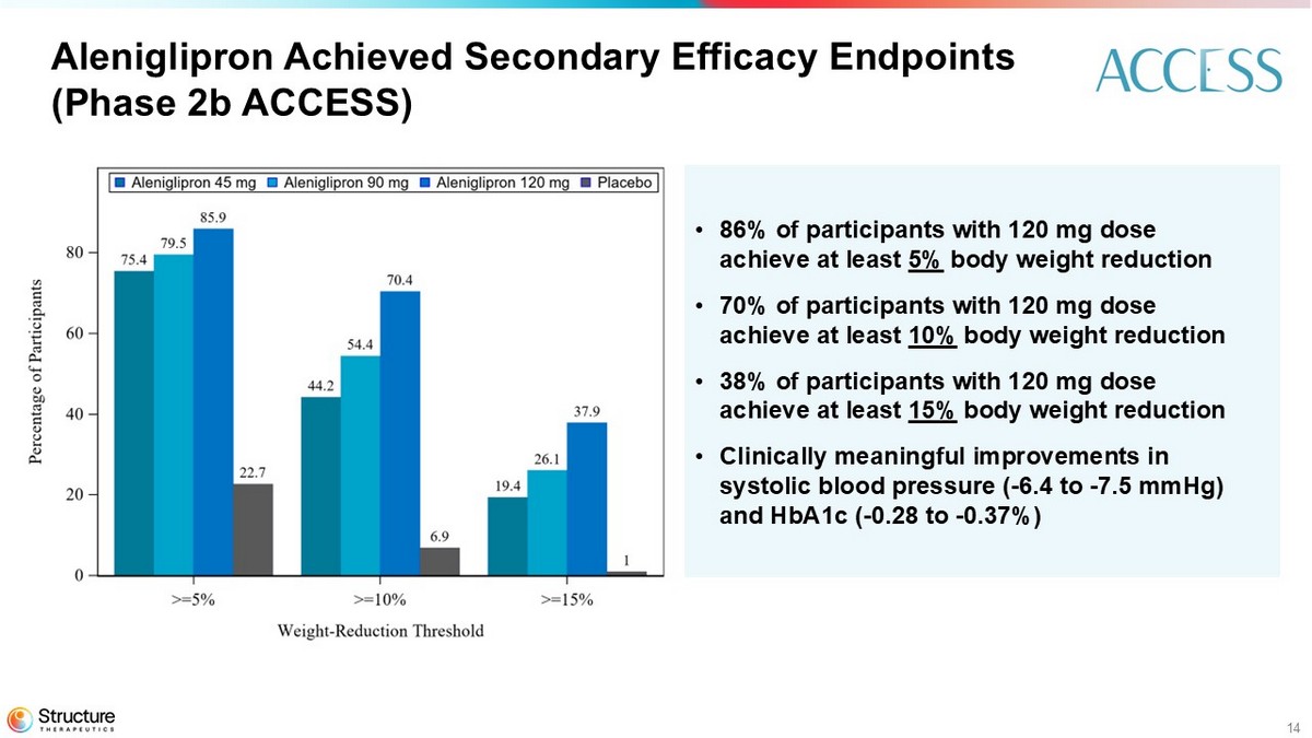 13 • 11.3% placebo - adjusted mean weight loss at 36 weeks with 120 mg • Dose dependent body weight reduction observed from 45 to 120 mg • No signs of weight loss plateau through 36 weeks across all dose ranges Aleniglipron Achieves Primary Efficacy Endpoint (Phase 2b ACCESS) 27.3 lbs 24.3 lbs 20.3 lbs - 8.2% ( - 11.1 to - 5.3) P<0.0001 - 9.8% ( - 12.5 to - 7.2) P<0.0001 - 11.3% ( - 13.9 to - 8.6) P<0.0001 LSM (95% CI) 45 mg 90 mg 120 mg Placebo Least - Squares Mean (LSM) Change (%) Body Weight