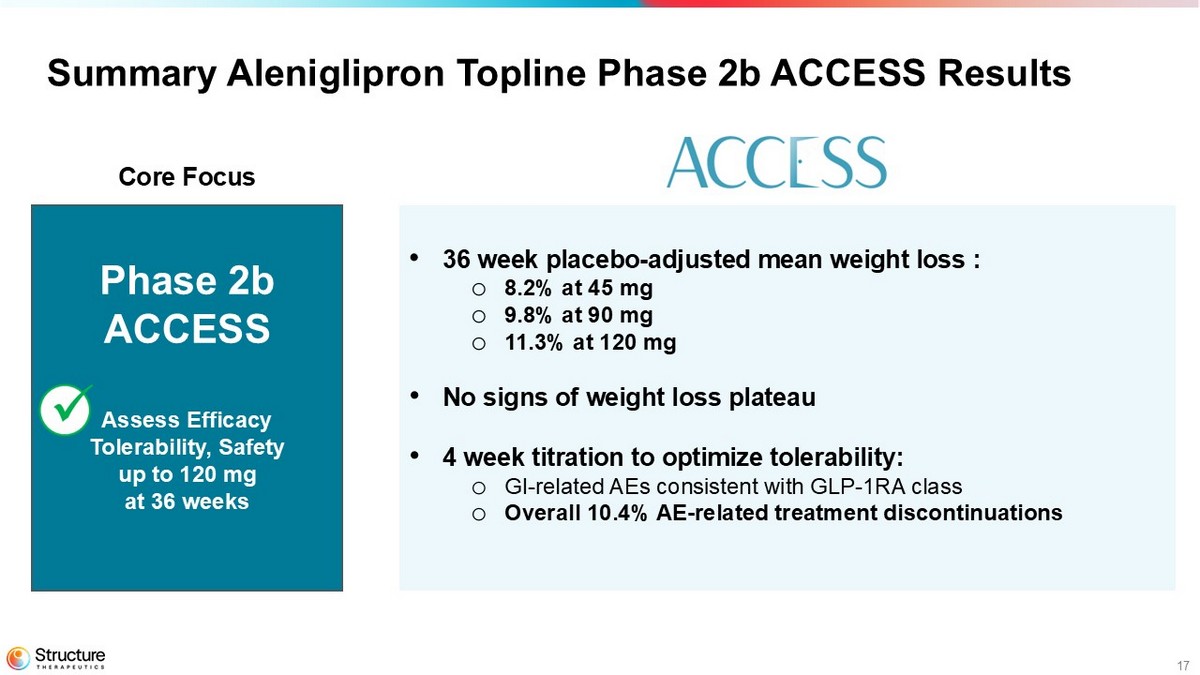 16 Cumulative Tolerability Profile Consistent with GLP - 1RA Class (Phase 2b ACCESS) Placebo N=56 Aleniglipron 120 mg N=63 Aleniglipron 90 mg N=65 Aleniglipron 45 mg N=45 N (%) Reporting at least one event * 5 mg 5 mg 5 mg Starting Dose 42 (75) 50 (78.1) 49 (75.4) 33 (73.3) Participants completed study on treatment 3 (5.4) 7 (11.1) 5 (7.7) 6 (13.3) Any TEAE leading to discontinuation of treatment 12 (21.4) 41 (65.1) 44 (67.7) 32 (71.1) Nausea 3 (5.4) 3 (5.4) 0 20 (31.7) 19 (30.2) 1 (1.6) 29 (44.6) 27 (41.5) 2 (3.1) 18 (40.0) 15 (33.3) 3 (6.7) Vomiting (overall) Mild and Moderate Severe 13 (23.2) 14 (22.2) 26 (40.0) 19 (42.2) Diarrhea 8 (14.3) 19 (30.2) 20 (30.8) 18 (40.0) Constipation • Overall 10.4% treatment discontinuations due to AEs • No dose response in most commonly GI - reported AEs *E - diary reporting is associated with an increase in the number of reported events