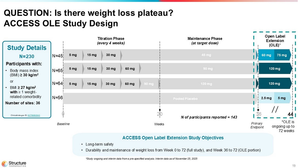 18 Multiple Aleniglipron Studies to Answer Key Questions Phase 2b ACCESS □ Assess Efficacy Tolerability, Safety up to 120 mg at 36 weeks Phase 3 Chronic Weight Management ACCESS Open Label Extension Interim analysis to evaluate efficacy of 120mg up to 44 - weeks Exploratory ACCESS II Evaluate efficacy at higher doses up to 180 mg and 240 mg Body Composition & Open Label Extension Evaluate tolerability with 2.5 mg starting dose Core Focus Key Questions Supplementary Studies Is there weight loss plateau beyond 36 weeks? Can we dose higher than 120 mg? Will lower 2.5 mg starting dose further improve tolerability?