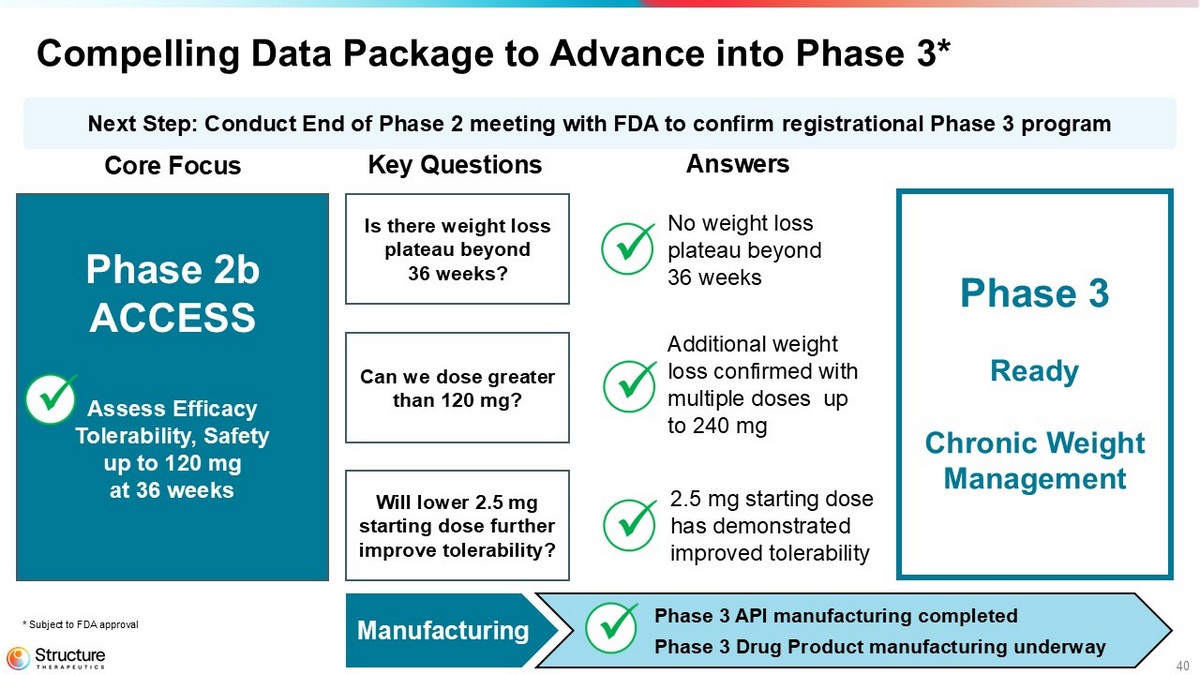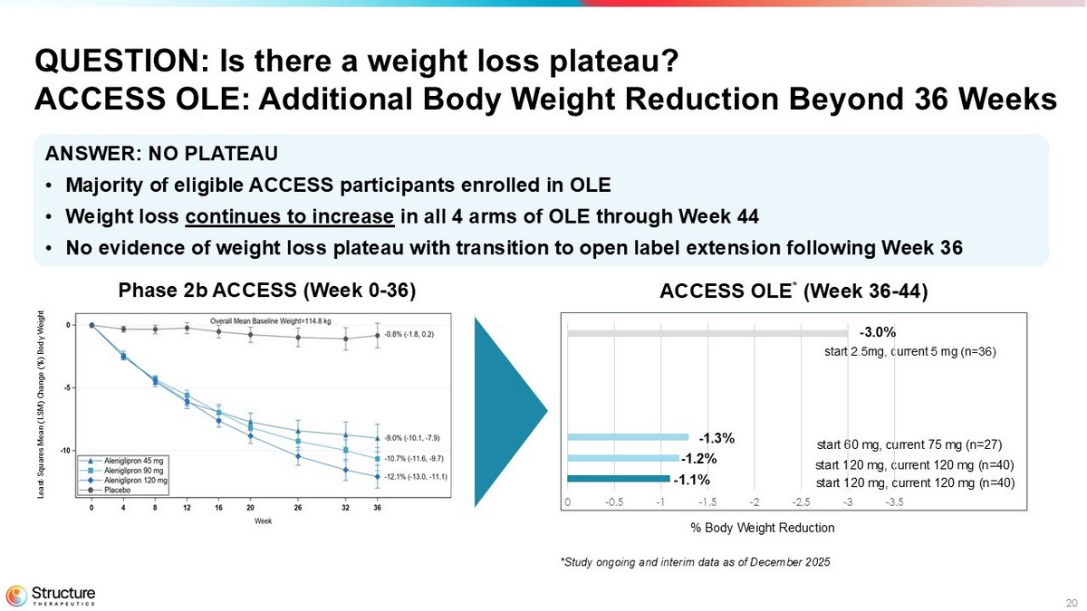 35 22 21.1 5.7 0 15.3 6.5 6.9 11.3 0 0 1.7 4.3 0 5 10 15 20 25 30 35 40 45 50 ACCESS 5 mg ACCESS-II 5 mg OLE 2.5 OLE 5 mg BC 2.5 mg BC 5 mg Nausea Vomiting Question: Will lower 2.5 mg starting dose further improve tolerability? Aleniglipron Tolerability with 5 mg vs 2.5 mg Starting Dose Percentage of participants Open Label Extension 2.5 mg to 5 mg ACCESS and ACCESS II start at 5 mg Body Composition (BC) 2.5 mg to 5 mg Week 1 – 4 N=173 Week 1 – 4 N=71 Week 1 – 4 Week 5 – 8 N=36 Week 1 – 4 Week 5 – 8 N=59 Answer: • Tolerability improved with lower 2.5 mg starting dose • No treatment discontinuations due to AEs after a median treatment of ~10 weeks * Study ongoing and interim data from a pre - specified analysis. Interim data as of November 25, 2025 Rationale: • Peak of GI - related events in ACCESS program occurred at the 5 mg starting dose • Majority of treatment discontinuations in ACCESS program occurred during the first 12 weeks