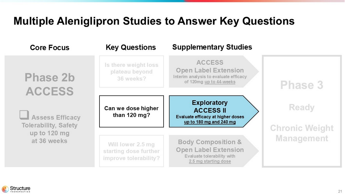 20 Phase 2b ACCESS (Week 0 - 36) ACCESS OLE * (Week 36 - 44) ANSWER: NO PLATEAU • Majority of eligible ACCESS participants enrolled in OLE • Weight loss continues to increase in all 4 arms of OLE through Week 44 • No evidence of weight loss plateau with transition to open label extension following Week 36 QUESTION: Is there a weight loss plateau? ACCESS OLE: Additional Body Weight Reduction Beyond 36 Weeks % Body Weight Reduction start 2.5mg, current 5 mg (n=36) start 60 mg, current 75 mg (n=27) start 120 mg, current 120 mg (n=40) -3.5 -3 -2.5 -2 -1.5 -1 -0.5 0 start 120 mg, current 120 mg (n=40) - 3.0% - 1.3% - 1.2% - 1.1% *Study ongoing and interim data as of December 2025 Least - Squares Mean (LSM) Change (%) Body Weight