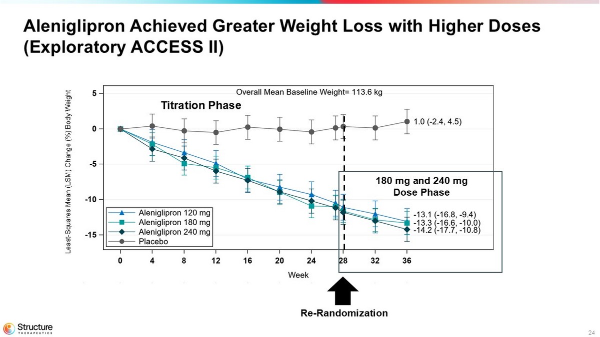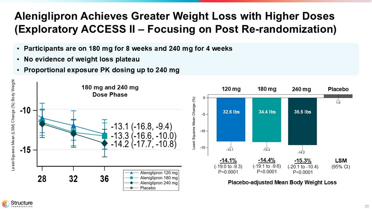 24 Aleniglipron Achieved Greater Weight Loss with Higher Doses (Exploratory ACCESS II) Re - Randomization Titration Phase 180 mg and 240 mg Dose Phase Least - Squares Mean (LSM) Change (%) Body Weight