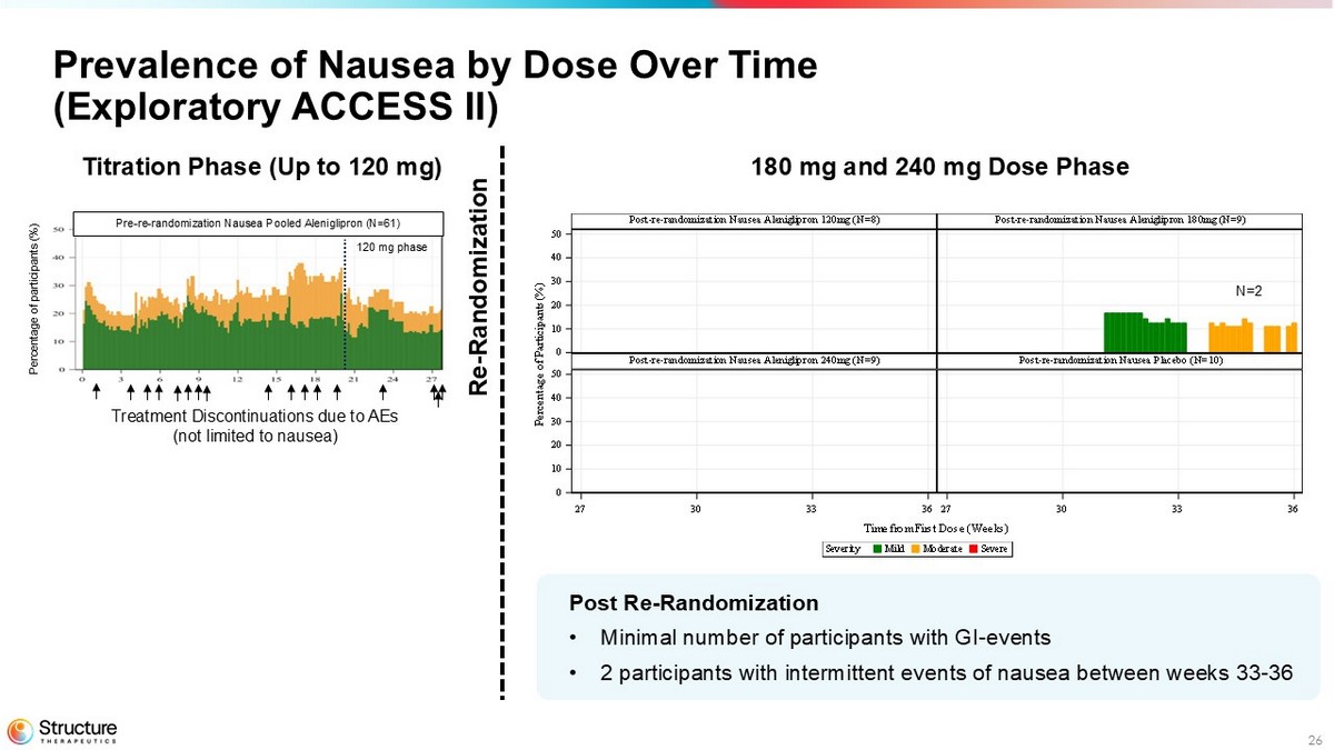 25 Aleniglipron Achieves Greater Weight Loss with Higher Doses (Exploratory ACCESS II – Focusing on Post Re - randomization) Analysis on going - draft results - 14.1% ( - 19.0 to - 9.3) P<0.0001 180 mg and 240 mg Dose Phase - 14.4% ( - 19.1 to - 9.6) P<0.0001 - 15.3% ( - 20.1 to - 10.4) P<0.0001 LSM (95% CI) 120 mg 180 mg 240 mg Placebo • Participants are on 180 mg for 8 weeks and 240 mg for 4 weeks • No evidence of weight loss plateau • Proportional exposure PK dosing up to 240 mg Least - Squares Mean (LSM) Change (%) Body Weight 32.6 lbs 34.4 lbs 35.5 lbs
