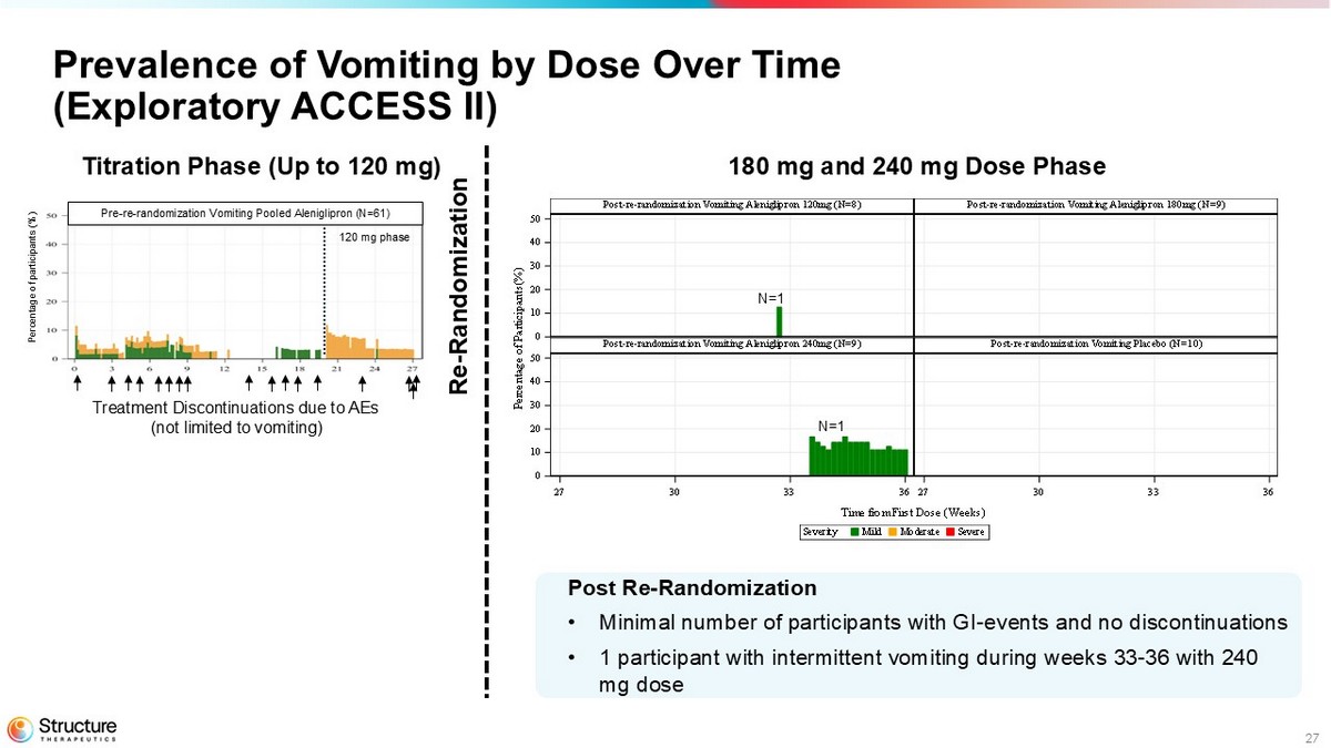 26 Prevalence of Nausea by Dose Over Time (Exploratory ACCESS II) Post Re - Randomization • Minimal number of participants with GI - events • 2 participants with intermittent events of nausea between weeks 33 - 36 SevereModerateMildSeverity Time from First Dose (Weeks) P e r c e n t a g e o f P a r t i c i p a n t s ( % ) Post-re-randomization Nausea Placebo (N=10)Post-re-randomization Nausea Aleniglipron 240mg (N=9) Post-re-randomization Nausea Aleniglipron 180mg (N=9)Post-re-randomization Nausea Aleniglipron 120mg (N=8) 27 30 33 3627 30 33 36 0 10 20 30 40 50 0 10 20 30 40 50 N=2 180 mg and 240 mg Dose Phase Titration Phase (Up to 120 mg) Pre - re - randomization Nausea Pooled Aleniglipron (N=61) Percentage of participants (%) Treatment Discontinuations due to AEs (not limited to nausea) 120 mg phase Re - Randomization