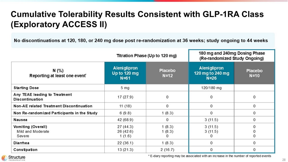 27 SevereModerateMildSeverity Time from First Dose (Weeks) P e r c e n t a g e o f P a r t i c i p a n t s ( % ) Post-re-randomization Vomiting Placebo (N=10)Post-re-randomization Vomiting Aleniglipron 240mg (N=9) Post-re-randomization Vomiting Aleniglipron 180mg (N=9)Post-re-randomization Vomiting Aleniglipron 120mg (N=8) 27 30 33 3627 30 33 36 0 10 20 30 40 50 0 10 20 30 40 50 Prevalence of Vomiting by Dose Over Time (Exploratory ACCESS II) N=1 N=1 180 mg and 240 mg Dose Phase Pre - re - randomization Vomiting Pooled Aleniglipron (N=61) Percentage of participants (%) Treatment Discontinuations due to AEs (not limited to vomiting) 120 mg phase Post Re - Randomization • Minimal number of participants with GI - events and no discontinuations • 1 participant with intermittent vomiting during weeks 33 - 36 with 240 mg dose Re - Randomization Titration Phase (Up to 120 mg)
