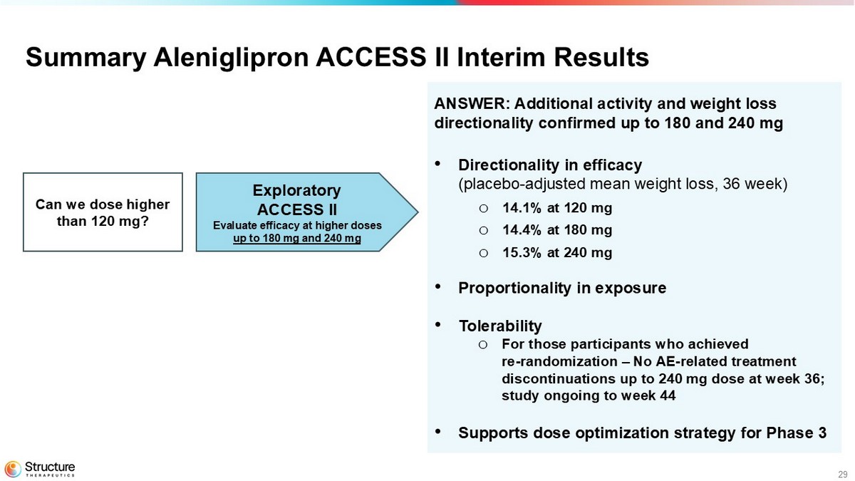 28 Cumulative Tolerability Results Consistent with GLP - 1RA Class (Exploratory ACCESS II) 180 mg and 240mg Dosing Phase (Re - randomized Study Ongoing) Titration Phase (Up to 120 mg) Placebo N=10 Aleniglipron 120 mg to 240 mg N=26 Placebo N=12 Aleniglipron Up to 120 mg N=61 N (%) Reporting at least one event * 120/180 mg 5 mg Starting Dose 0 0 0 17 (27.9) Any TEAE leading to Treatment Discontinuation 0 0 0 11 (18) Non - AE related Treatment Discontinuation 0 0 1 (8.3) 6 (9.8) Non Re - randomized Participants in the Study 0 3 (11.5) 0 42 (68.9) Nausea 0 0 0 3 (11.5) 3 (11.5) 0 1 (8.3) 1 (8.3) 0 27 (44.3) 26 (42.6) 1 (1.6) Vomiting (Overall) Mild and Moderate Severe 0 0 1 (8.3) 22 (36.1) Diarrhea 0 0 2 (16.7) 13 (21.3) Constipation N o discontinuations at 120, 180, or 240 mg dose post r e - randomization at 36 weeks; study ongoing to 44 weeks *E - diary reporting is associated with an increase in the number of reported events