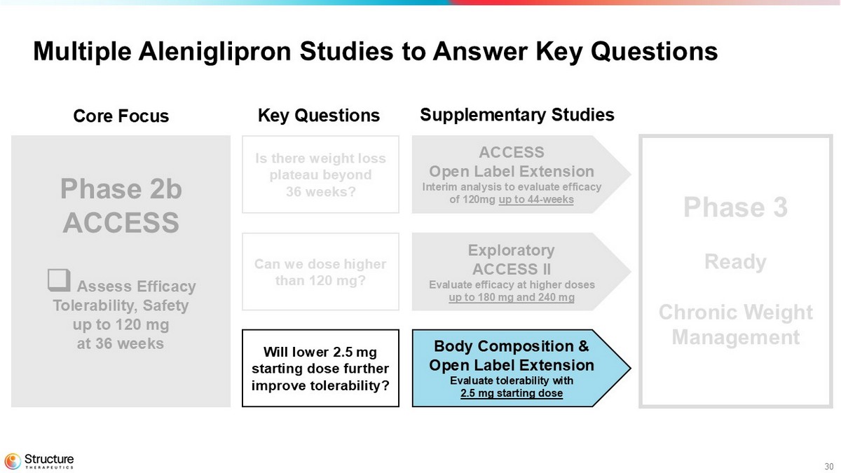 29 ANSWER: Additional activity and weight loss directionality confirmed up to 180 and 240 mg • Directionality in efficacy (placebo - adjusted mean weight loss, 36 week ) o 14.1% at 120 mg o 14.4% at 180 mg o 15.3% at 240 mg • Proportionality in exposure • Tolerability o For those participants who achieved re - randomization – No AE - related treatment discontinuations up to 240 mg dose at week 36; study ongoing to week 44 • Supports dose optimization strategy for Phase 3 Summary Aleniglipron ACCESS II Interim Results Exploratory ACCESS II Evaluate efficacy at higher doses up to 180 mg and 240 mg Can we dose higher than 120 mg?