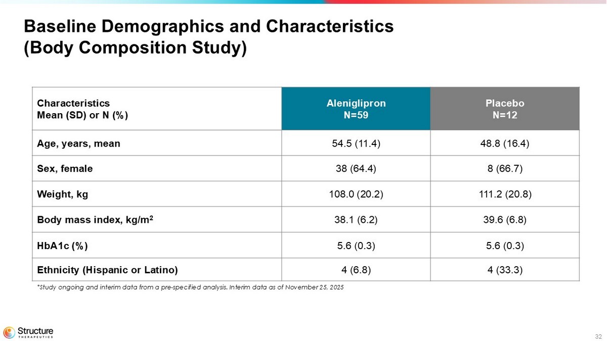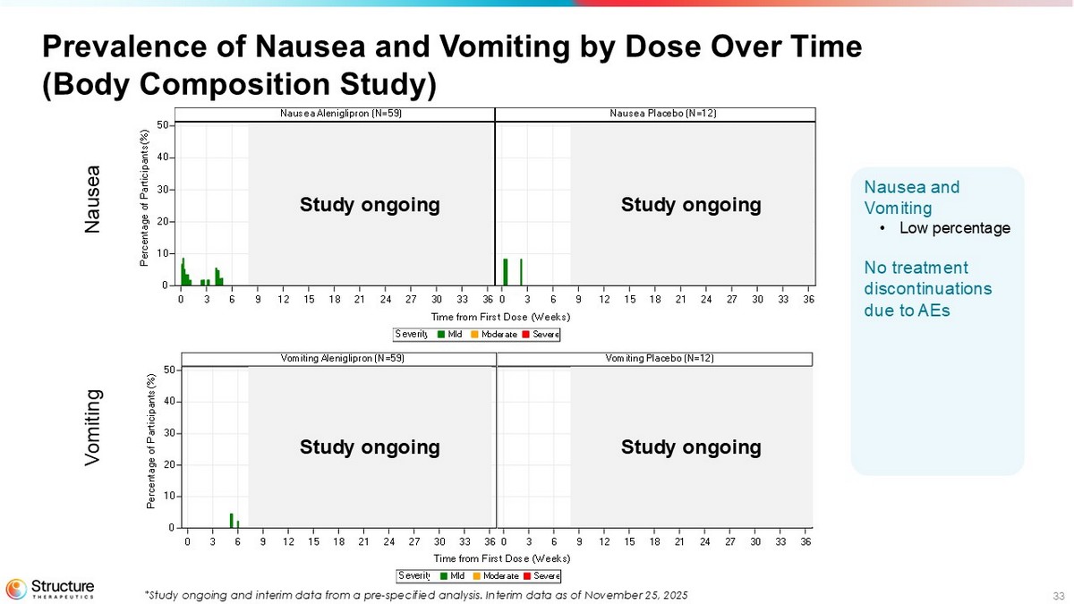 32 Baseline Demographics and Characteristics (Body Composition Study) Placebo N=12 Aleniglipron N=59 Characteristics Mean (SD) or N (%) 48.8 (16.4) 54.5 (11.4) Age, years, mean 8 (66.7) 38 (64.4) Sex, female 111.2 (20.8) 108.0 (20.2) Weight, kg 39.6 (6.8) 38.1 (6.2) Body mass index, kg/m 2 5.6 (0.3) 5.6 (0.3) HbA1c (%) 4 (33.3) 4 (6.8) Ethnicity (Hispanic or Latino) *Study ongoing and interim data from a pre - specified analysis. Interim data as of November 25, 2025