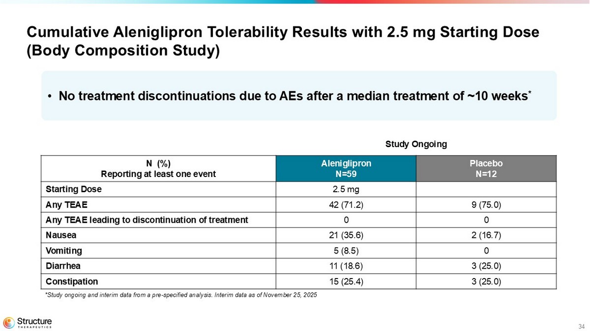 33 Prevalence of Nausea and Vomiting by Dose Over Time (Body Composition Study) SevereModerateMildSeverity Time from First Dose (Weeks) Nausea Placebo (N=12)Nausea Aleniglipron (N=59) 0 3 6 9 12 15 18 21 24 27 30 33 360 3 6 9 12 15 18 21 24 27 30 33 36 0 10 20 30 40 50 P e r c e n t a g e o f P a r t i c i p a n t s ( % ) SevereModerateMildSeverity Time from First Dose (Weeks) Vomiting Placebo (N=12)Vomiting Aleniglipron (N=59) 0 3 6 9 12 15 18 21 24 27 30 33 360 3 6 9 12 15 18 21 24 27 30 33 36 0 10 20 30 40 50 P e r c e n t a g e o f P a r t i c i p a n t s ( % ) Nausea Vomiting Study ongoing Study ongoing Study ongoing Study ongoing Nausea and Vomiting • Low percentage No treatment discontinuations due to AEs *Study ongoing and interim data from a pre - specified analysis. Interim data as of November 25, 2025
