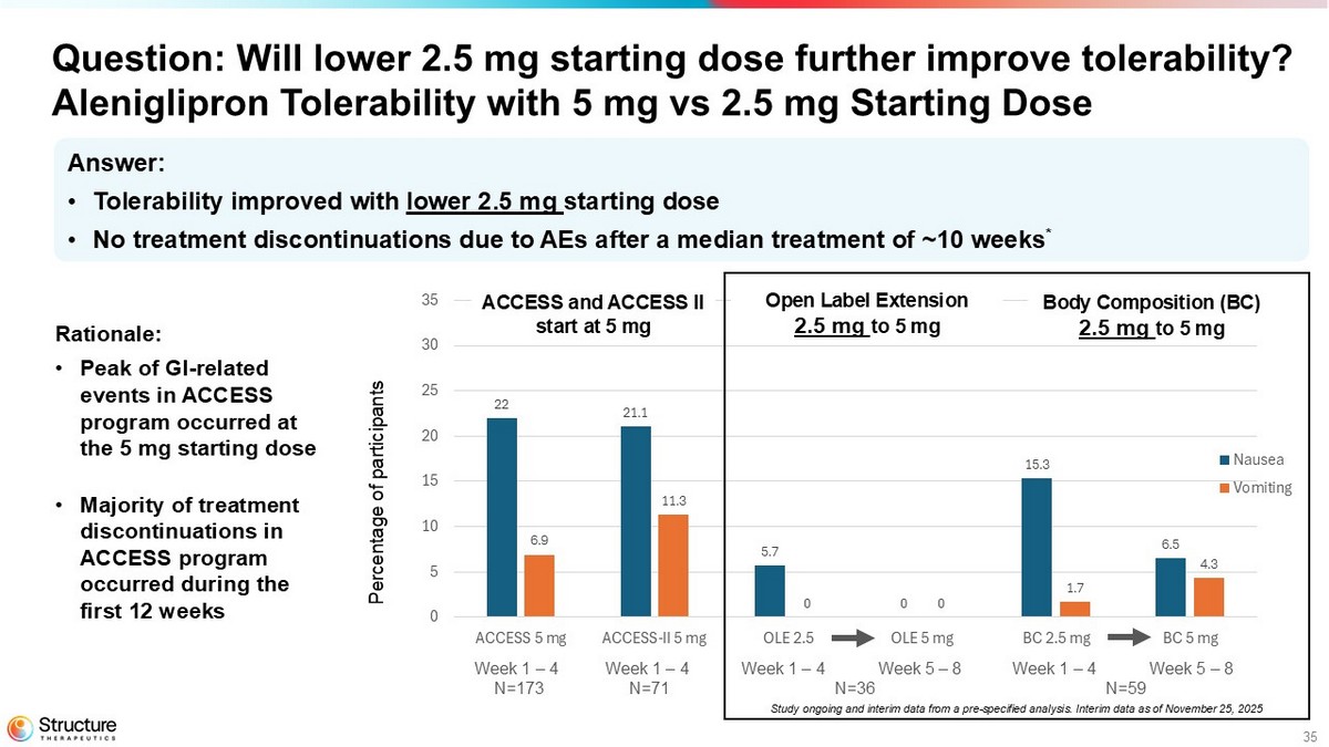34 Cumulative Aleniglipron Tolerability Results with 2.5 mg Starting Dose (Body Composition Study) Study Ongoing Placebo N=12 Aleniglipron N=59 N (%) Reporting at least one event 2.5 mg Starting Dose 9 (75.0) 42 (71.2) Any TEAE 0 0 Any TEAE leading to discontinuation of treatment 2 (16.7) 21 (35.6) Nausea 0 5 (8.5) Vomiting 3 (25.0) 11 (18.6) Diarrhea 3 (25.0) 15 (25.4) Constipation • No treatment discontinuations due to AEs after a median treatment of ~10 weeks * *Study ongoing and interim data from a pre - specified analysis. Interim data as of November 25, 2025