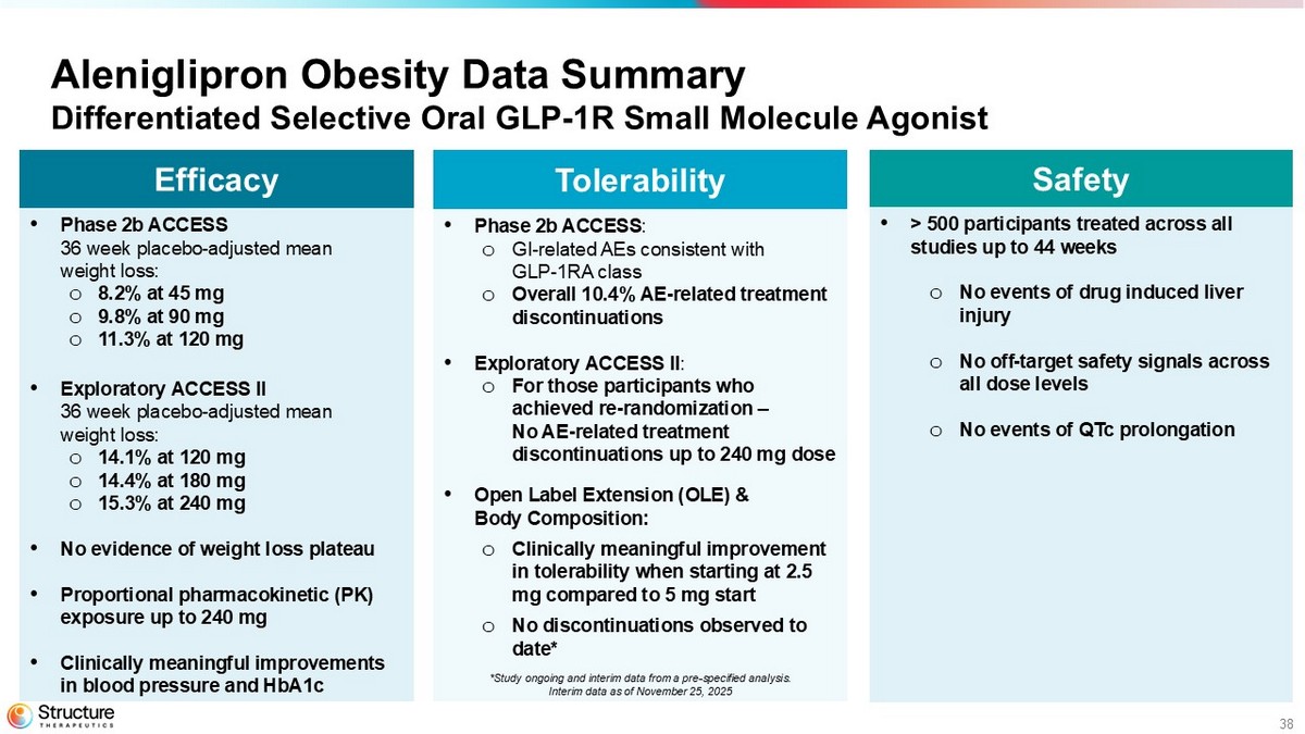 37 Aleniglipron Demonstrated Favorable Off - Target Safety Results Body Composition 2 Exploratory ACCESS II (up to 240 mg) ACCESS OLE 1 Phase 2b ACCESS (up to 120 mg) N (%) Placebo N=12 N=59 Placebo N=10 N=61 N=143 Placebo N=56 120 mg N=63 90 mg N=65 45 mg N=45 0 0 0 0 2 (1.4) 1 (1.8) 2 (3.2) 3 (4.8) 1 (2.3) ALT ≥ 3x ULN 0 0 0 0 1 (0.7) 0 0 1 (1.6) 0 ALT ≥ 5x ULN 0 0 0 0 0 0 0 0 0 ALT ≥ 10x ULN 0 0 0 1 (1.7) 0 1 (1.8) 0 0 0 AST ≥ 3x ULN 0 0 0 1 (1.7) 0 0 0 0 0 AST ≥ 5x ULN 0 0 0 0 0 0 0 0 0 AST ≥ 10x ULN 0 0 0 0 0 0 0 0 0 ALT or AST ≥ 3 x ULN Total Bilirubin ≥ 3 x ULN • No cases of drug - induced liver injury • No cases of ALT or AST ≥ 10x upper limit of normal (ULN) • All cases of elevated ALT and AST resolved without treatment discontinuation 1 Interim data as of November 26, 2025 2 Interim data as of November 25, 2025