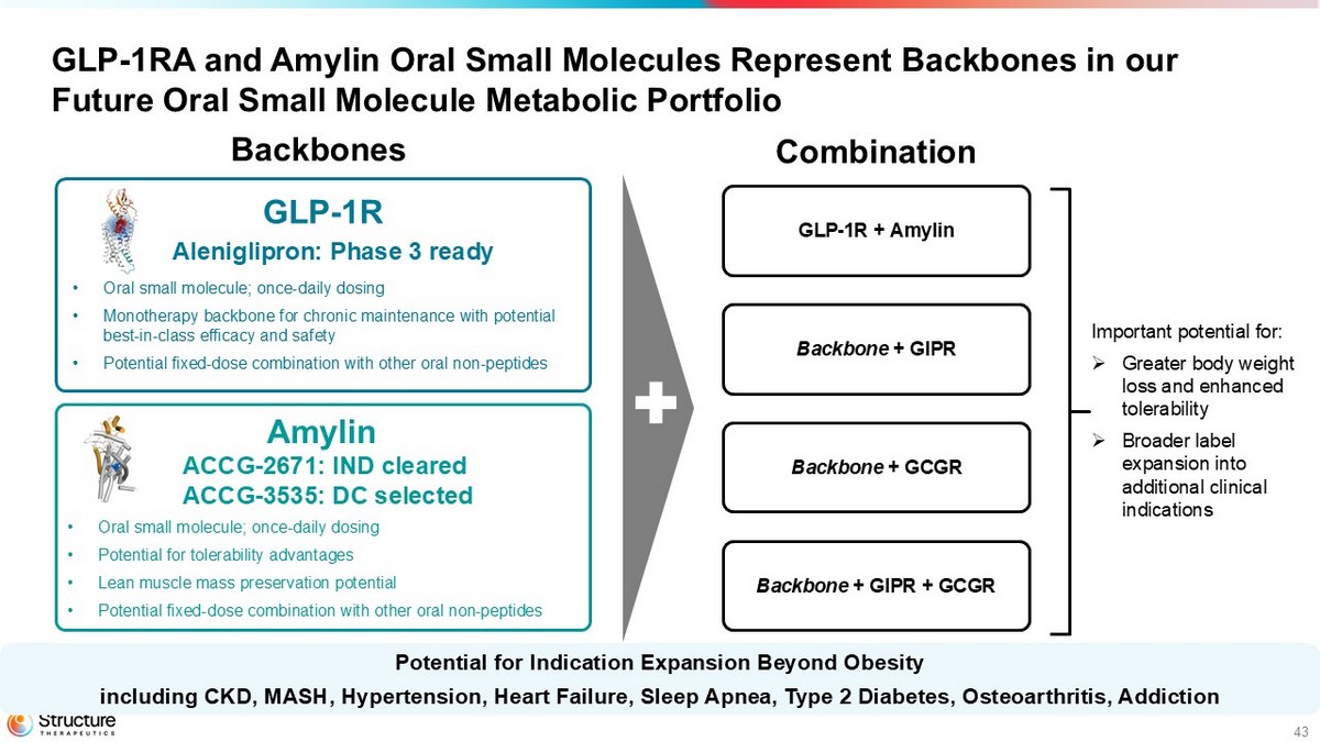 42 Aleniglipron is Differentiated and is Well Positioned to Capture a Significant Proportion of the Growing Obesity Market 2025 2026 2027 2028 2029 2030 Specialists Non - specialists Non - specialists = 75% Rx today and growing 3 Only > 5M patients on incretin treatment today in US 2 1. World Obesity Atlas 2024 https://s3 - eu - west - 1.amazonaws.com/wof - files/WOF_Obesity_Atlas_2024.pdf 2. August 2025 Symphony Health prescription data and 2025 Evaluate Pharma sales data 3 Kumar et al., ISPOR (2025). https://www.ispor.org/docs/default - source/cti - meeting - 21021 - documents/6fe2eb97 - d003 - 4dc0 - b6d0 - 812 e13795055.pdf?sfvrsn=45a94bc8_0. Based on July 2025 TRx data for Wegovy. Non - specialists include PCPs, Nurse Practitioners, Phys ician Assistants, and Family Medicine physicians 4 Based on internal physician survey and interview data 5.Triangulation between internal data, analog disease areas, and 3rd party estimates; • PCPs/non - specialists indicate higher preference for orals due to convenience & potential for broader access and coverage 4 • Orals represent an exciting new option for long - term maintenance; more optionality for patients could facilitate improved persistence • Oral small molecules well - positioned to address unmet needs; 25 - 50% of market could be orals 5 • 15.3% placebo - adjusted mean weight loss at 36 weeks with 240 mg • Proportional exposure up to 240 mg • No evidence of weight loss plateau • 2.5 mg start further improves tolerability • Scaleable to meet global demand Only oral small molecules can scale and meet the needs of the global obesity patient population, estimated to be 1.5 billion by 2030 1 GLP - 1R Aleniglipron