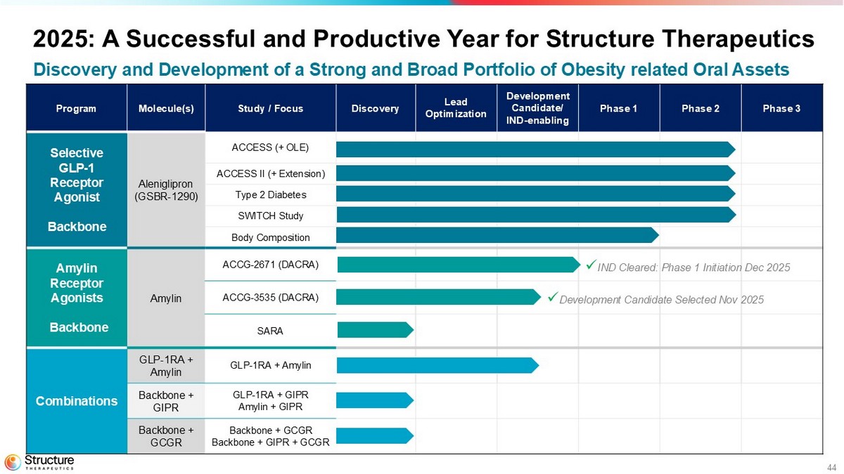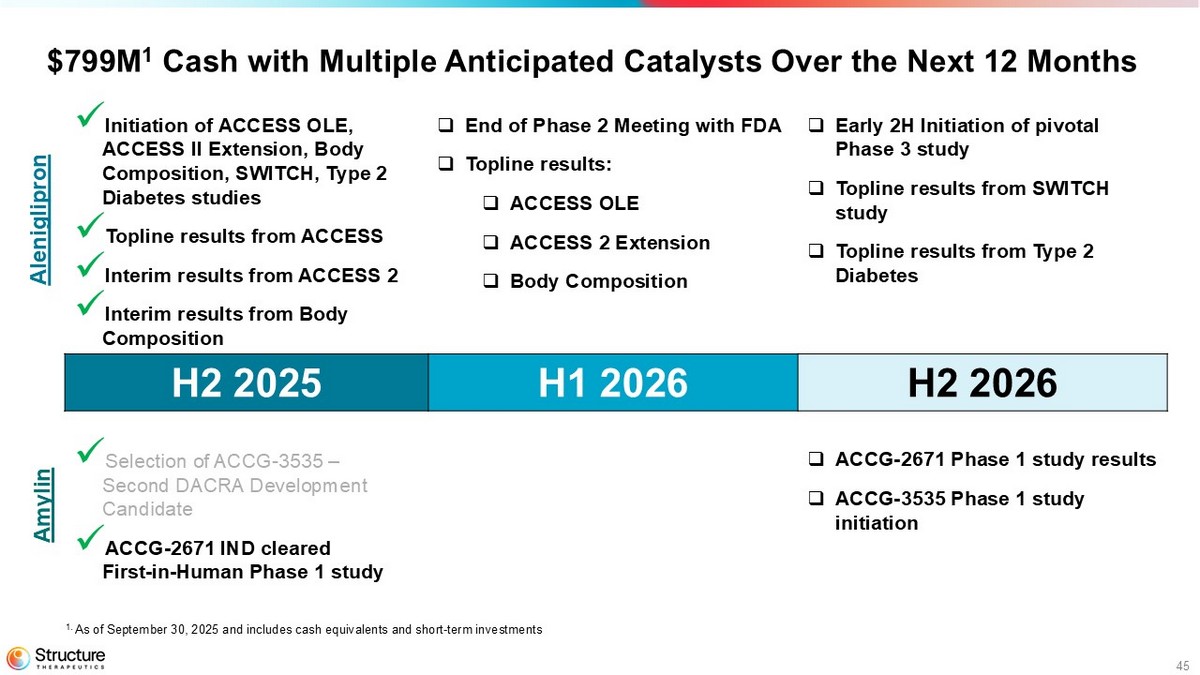 44 Phase 3 Phase 2 Phase 1 Development Candidate/ IND - enabling Lead Optimization Discovery Study / Focus Molecule(s) Program ACCESS (+ OLE) Aleniglipron (GSBR - 1290) Selective GLP - 1 Receptor Agonist Backbone ACCESS II (+ Extension) Type 2 Diabetes SWITCH Study Body Composition ACCG - 2671 (DACRA) Amylin Amylin Receptor Agonists Backbone ACCG - 3535 (DACRA) SARA GLP - 1RA + Amylin GLP - 1RA + Amylin Combinations GLP - 1RA + GIPR Amylin + GIPR Backbone + GIPR Backbone + GCGR Backbone + GIPR + GCGR Backbone + GCGR x IND Cleared: Phase 1 I nitiation Dec 2025 x Development Candidate Selected Nov 2025 2025: A Successful and Productive Year for Structure Therapeutics Discovery and Development of a Strong and Broad Portfolio of Obesity related Oral Assets