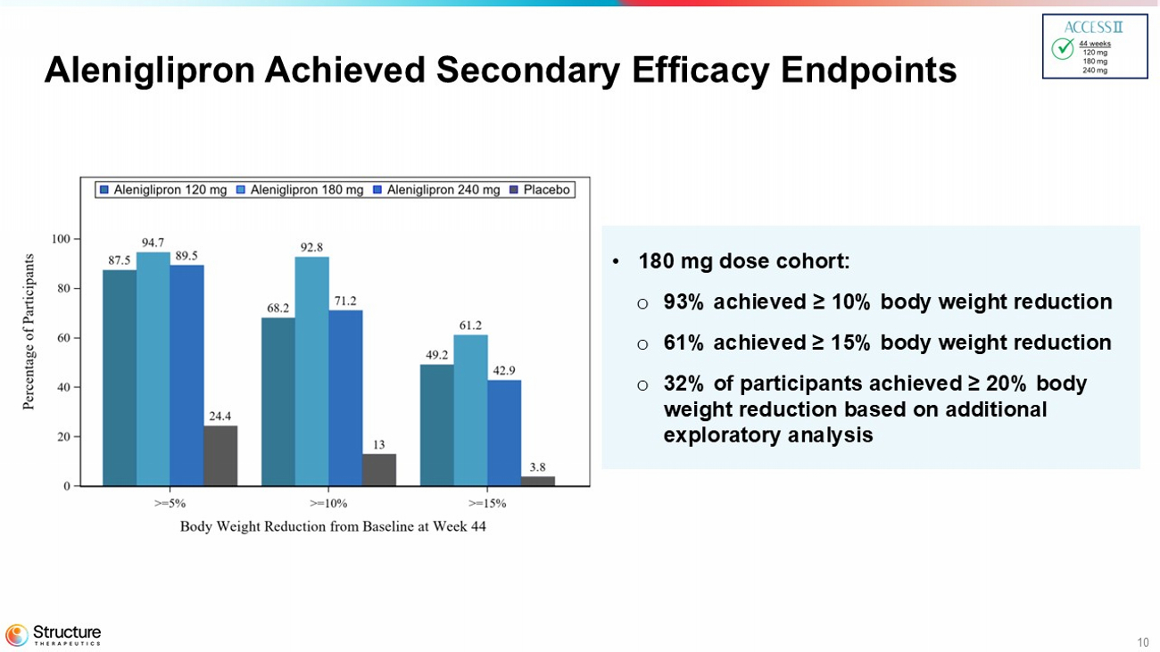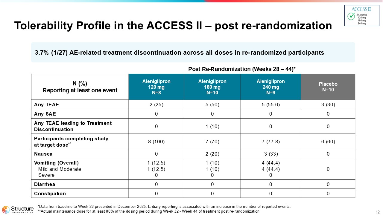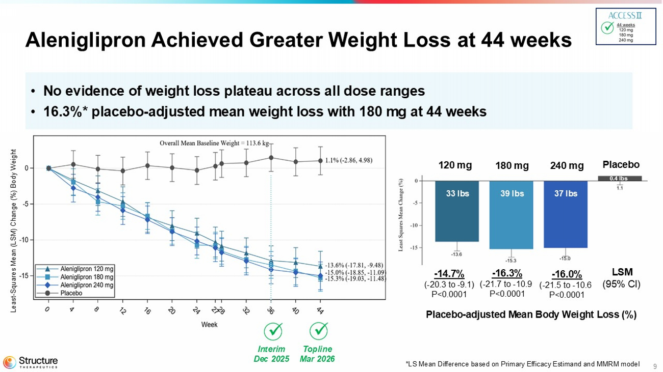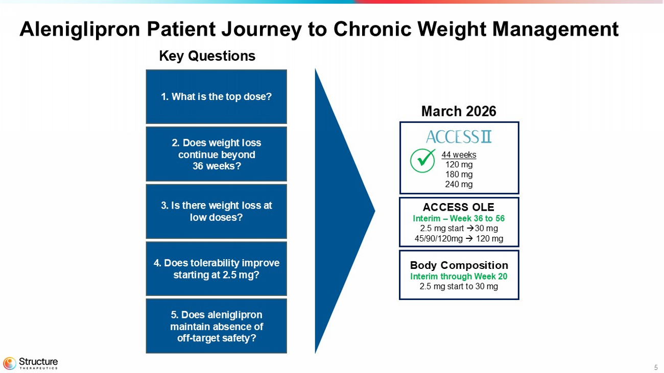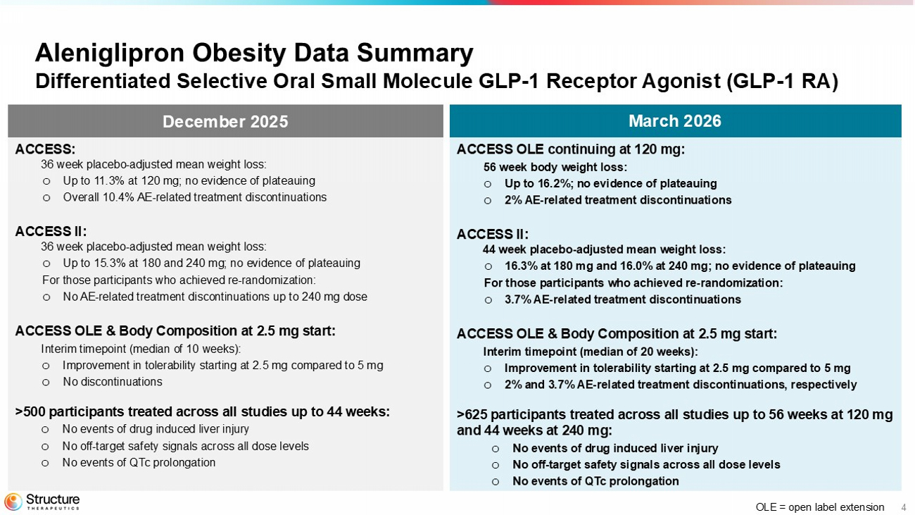 4 March 2026 ACCESS OLE continuing at 120 mg: 56 week body weight loss: o Up to 16.2%; n o evidence of plateauing o 2% AE - related treatment discontinuations ACCESS II: 44 week p lacebo - adjusted mean weight loss: o 16.3% at 180 mg and 16.0% at 240 mg; no evidence of plateauing For those participants who achieved re - randomization: o 3.7% AE - related treatment discontinuations ACCESS OLE & Body Composition at 2.5 mg start: Interim timepoint (median of 20 weeks): o Improvement in tolerability starting at 2.5 mg compared to 5 mg o 2% and 3.7% AE - related treatment discontinuations, respectively >625 participants treated across all studies up to 56 weeks at 120 mg and 44 weeks at 240 mg: o No events of drug induced liver injury o No off - target safety signals across all dose levels o No events of QTc prolongation Aleniglipron Obesity Data Summary Differentiated Selective Oral Small Molecule GLP - 1 Receptor Agonist (GLP - 1 RA) December 2025 ACCESS: 36 week placebo - adjusted mean weight loss: o Up to 11.3% at 120 mg; no evidence of plateauing o Overall 10.4% AE - related treatment discontinuations ACCESS II: 36 week p lacebo - adjusted mean weight loss: o Up to 15.3% at 180 and 240 mg; no evidence of plateauing For those participants who achieved re - randomization: o No AE - related treatment discontinuations up to 240 mg dose ACCESS OLE & Body Composition at 2.5 mg start: Interim timepoint (median of 10 weeks): o Improvement in tolerability starting at 2.5 mg compared to 5 mg o No discontinuations >500 participants treated across all studies up to 44 weeks: o No events of drug induced liver injury o No off - target safety signals across all dose levels o No events of QTc prolongation OLE = open label extension