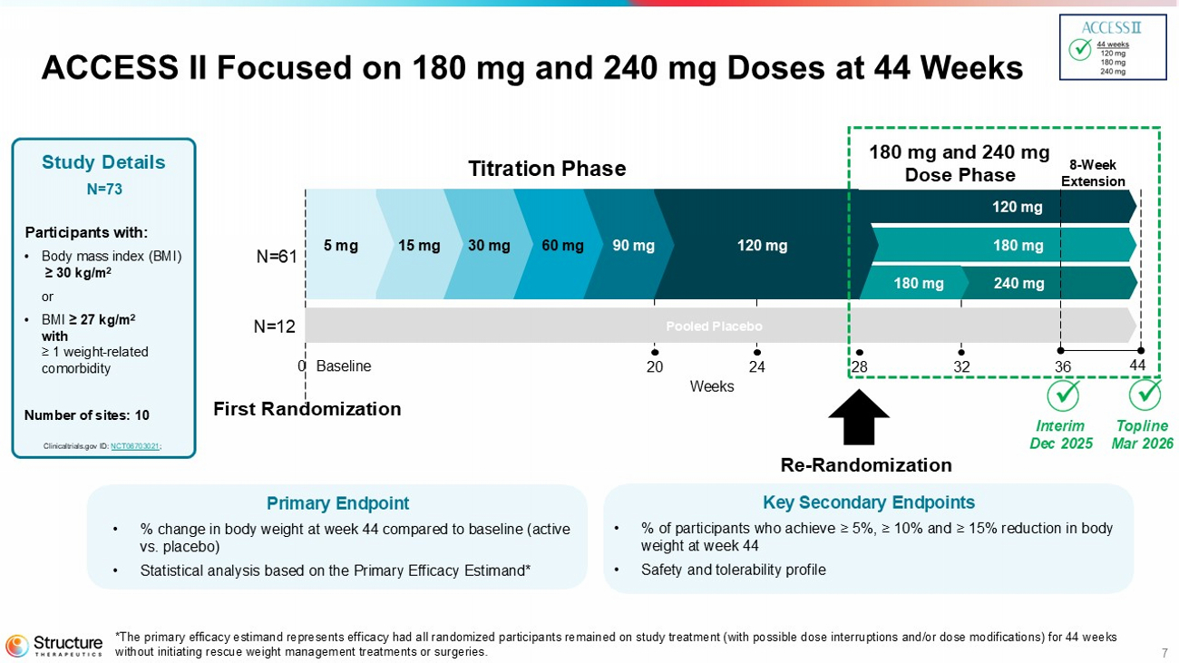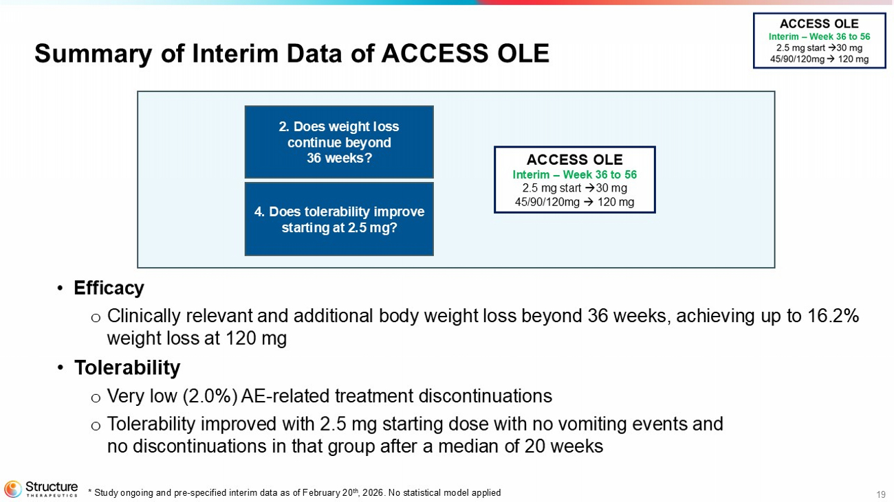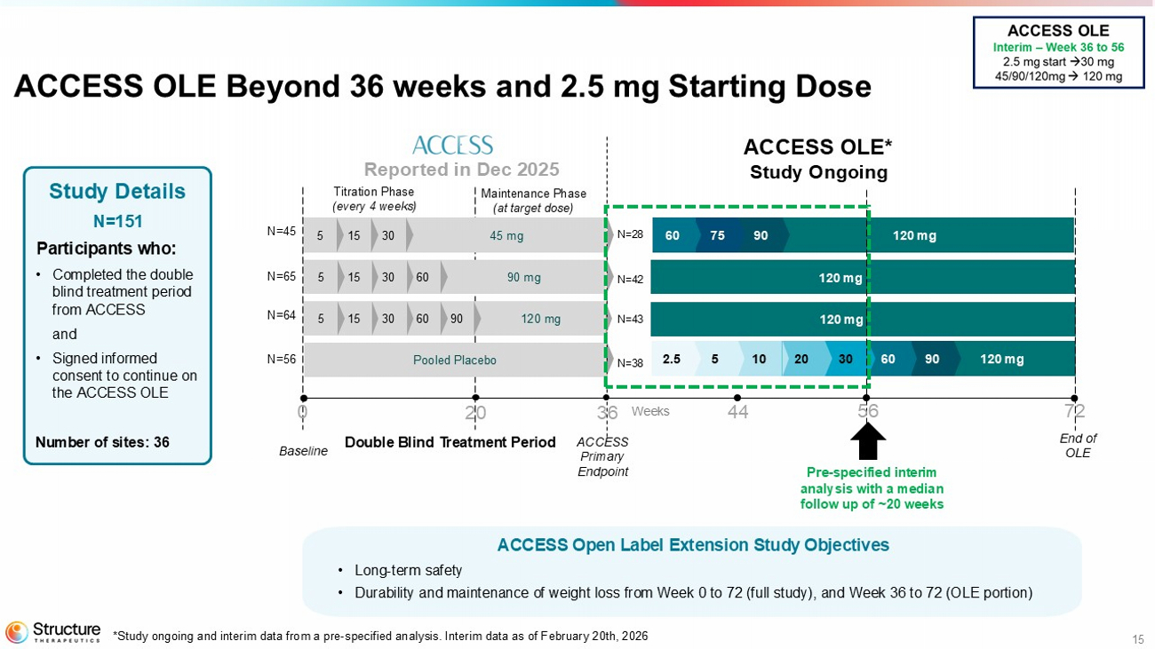 15 120 mg ACCESS OLE Beyond 36 weeks and 2.5 mg Starting Dose Baseline Titration Phase (every 4 weeks) Maintenance Phase (at target dose) ACCESS Primary Endpoint 30 15 5 N=45 N=65 N=64 N=56 *OLE is ongoing up to 72 weeks 45 mg 90 mg 60 30 15 5 120 mg 60 30 15 5 90 Pooled Placebo 75 120 mg 90 60 30 20 10 5 2.5 120 mg 120 mg 60 90 End of OLE Pre - specified interim analysis with a median follow up of ~20 weeks Study Details N=151 Participants who: • Completed the double blind treatment period from ACCESS and • Signed informed consent to continue on the ACCESS OLE Number of sites: 36 ACCESS Open Label Extension Study Objectives • Long - term safety • Durability and maintenance of weight loss from Week 0 to 72 (full study), and Week 36 to 72 (OLE portion) *Study ongoing and interim data from a pre - specified analysis. Interim data as of February 20th, 2026 Double Blind Treatment Period N=28 N=42 N=43 N=38 Weeks 0 20 36 44 56 72 ACCESS OLE* Study Ongoing Reported in Dec 2025