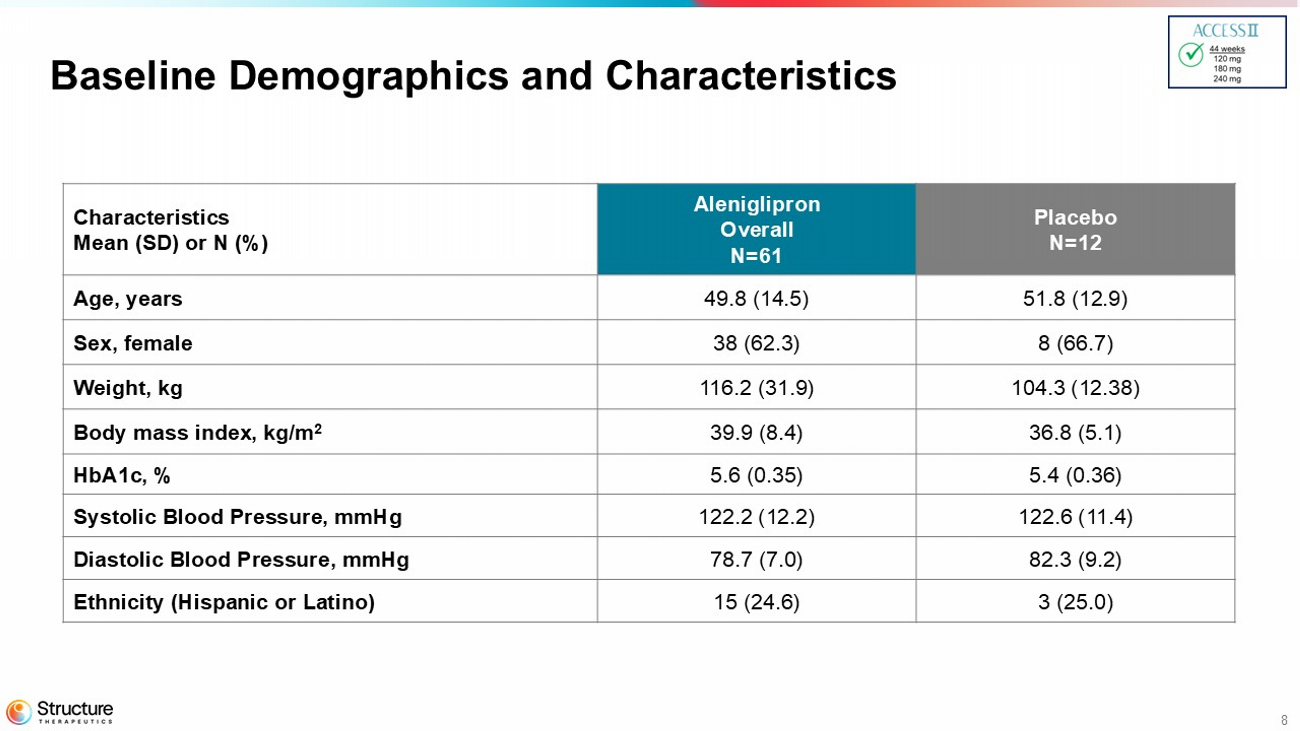 8 Placebo N=12 Aleniglipron Overall N=61 Characteristics Mean (SD) or N (%) 51.8 (12.9) 49.8 (14.5) Age, years 8 (66.7) 38 (62.3) Sex, female 104.3 (12.38) 116.2 (31.9) Weight, kg 36.8 (5.1) 39.9 (8.4) Body mass index, kg/m 2 5.4 (0.36) 5.6 (0.35) HbA1c, % 122.6 (11.4) 122.2 (12.2) Systolic Blood Pressure, mmHg 82.3 (9.2) 78.7 (7.0) Diastolic Blood Pressure, mmHg 3 (25.0) 15 (24.6) Ethnicity (Hispanic or Latino) Baseline Demographics and Characteristics