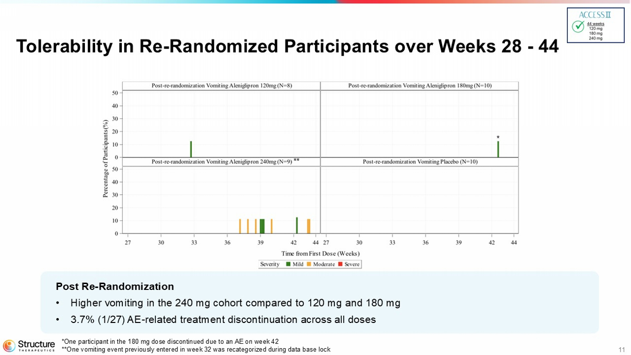 10 Aleniglipron Achieved Secondary Efficacy Endpoints • 180 mg dose cohort: o 9 3% achieved ≥ 10% body weight reduction o 61% achieved ≥ 15% body weight reduction o 32% of participants achieved ≥ 20% body weight reduction based on additional exploratory analysis