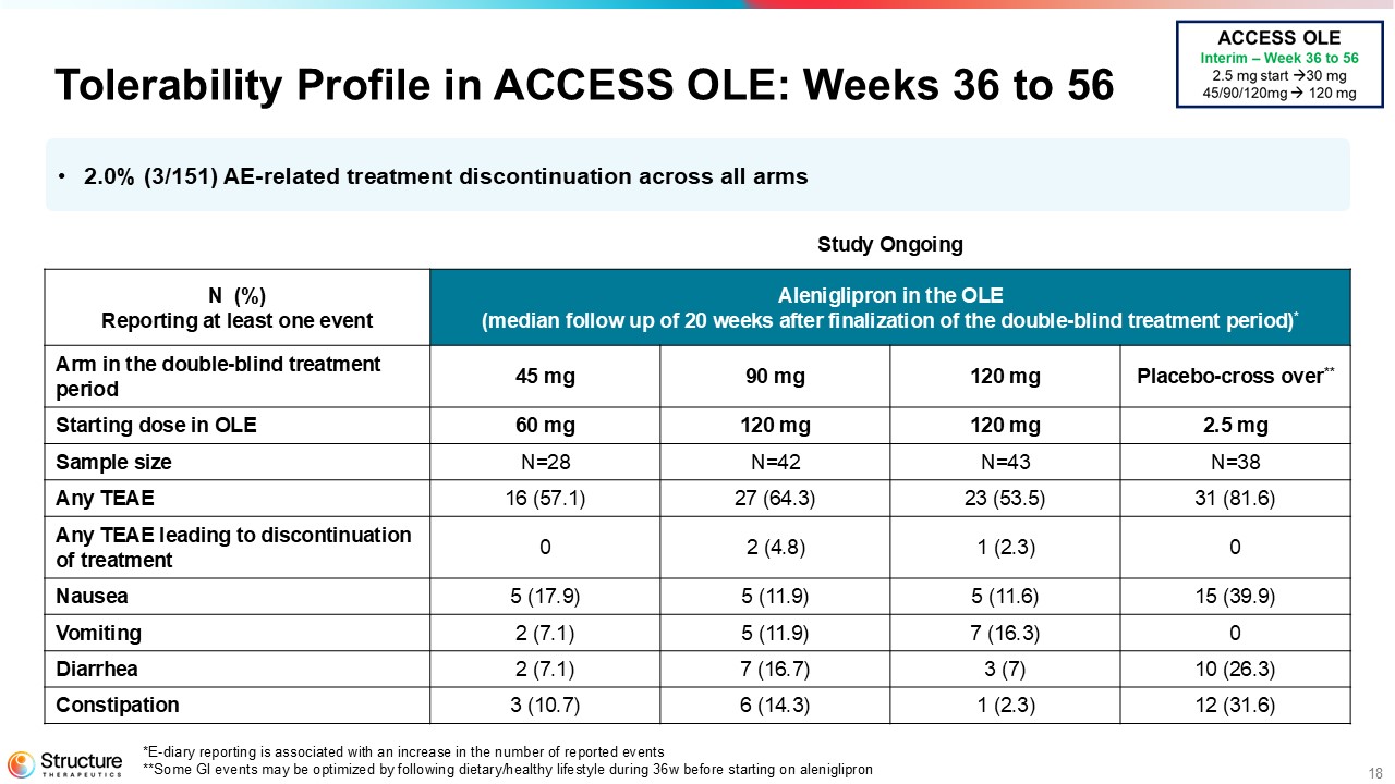 17 Improved Tolerability with the 2.5 mg Starting Dose • Occasional events of nausea reported and no events of vomiting • No study drug discontinuations in participants starting the OLE at 2.5 mg of aleniglipron after a median follow up of 20 weeks Study ongoing Study ongoing Nausea - Aleniglipron (N=38) Vomiting - Aleniglipron (N=38) Placebo - crossover Participants