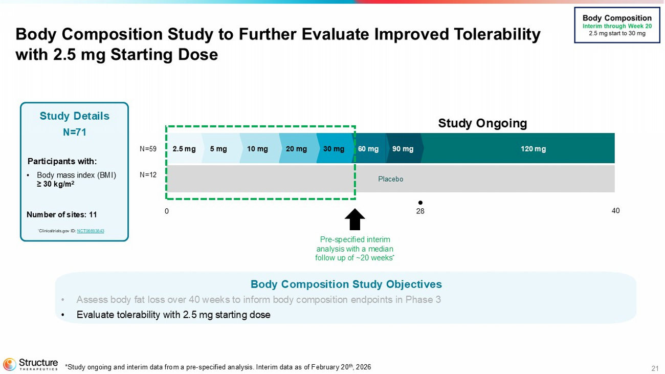 20 Aleniglipron Patient Journey to Chronic Weight Management Body Composition Interim through Week 20 2.5 mg start to 30 mg 3 . Is there weight loss at low doses? 4 . Does tolerability improve starting at 2.5 mg?