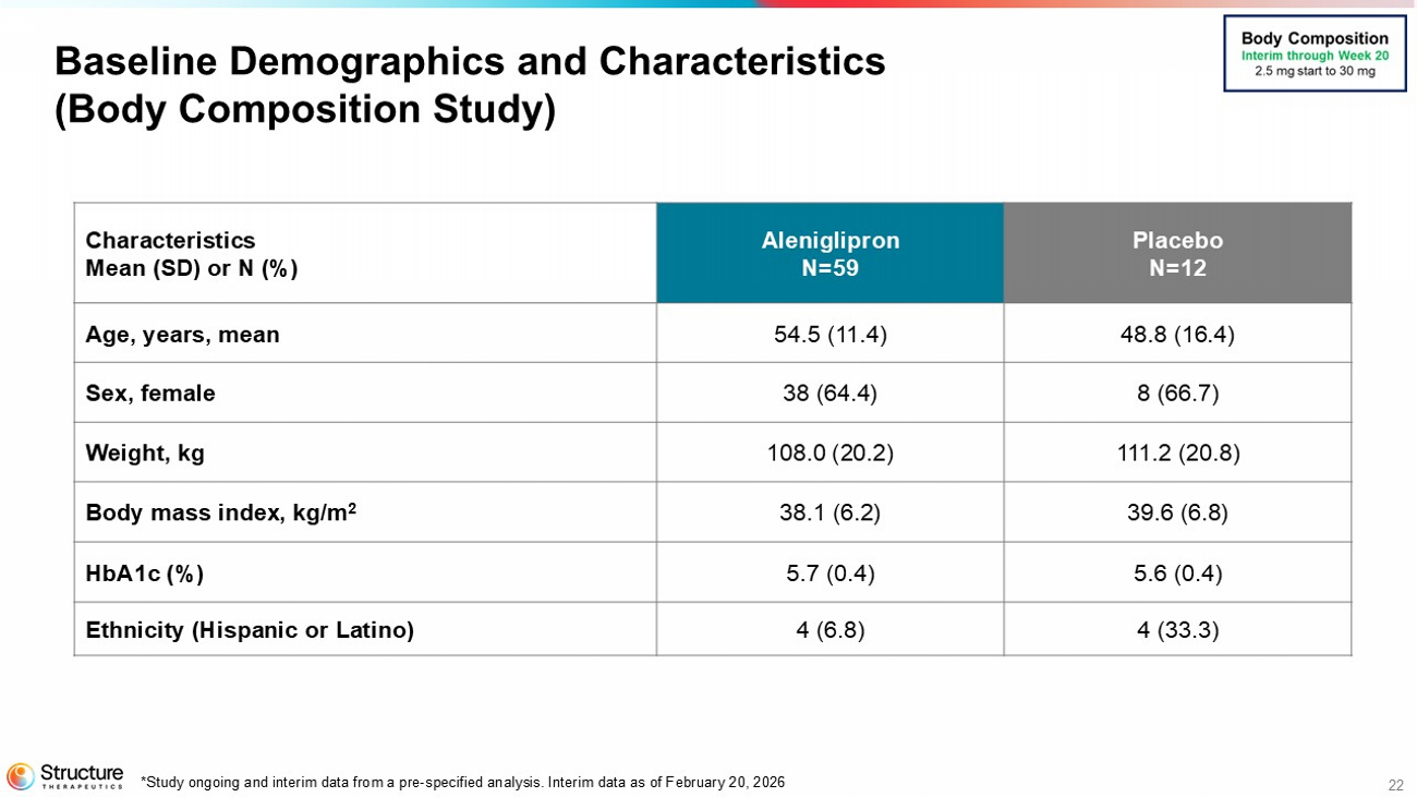 21 Body Composition Study to Further Evaluate Improved Tolerability with 2.5 mg Starting Dose Body Composition Study Objectives • Assess body fat loss over 40 weeks to inform body composition endpoints in Phase 3 • Evaluate tolerability with 2.5 mg starting dose Study Details N=71 Participants with: • Body mass index (BMI) ≥ 30 kg/m 2 Number of sites: 11 * Clinicaltrials.gov ID: NCT06693843 *Study ongoing and interim data from a pre - specified analysis. Interim data as of February 20 th , 2026 Study Ongoing Pre - specified interim analysis with a median follow up of ~20 weeks * 120 mg 90 mg 0 28 40 6 0 mg 3 0 mg 2 0 mg 10 mg 5 mg 2.5 mg N=59 N=12 Placebo
