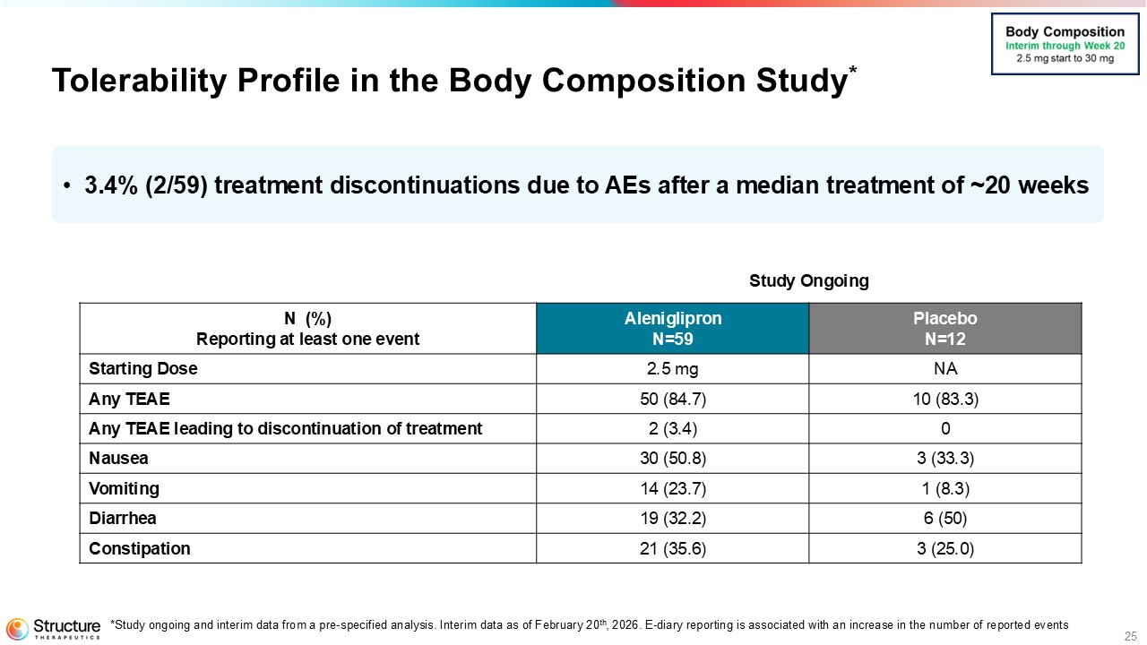 25 Tolerability Profile in the Body Composition Study * Study Ongoing Placebo N=12 Aleniglipron N=59 N (%) Reporting at least one event NA 2.5 mg Starting Dose 10 (83.3) 50 (84.7) Any TEAE 0 2 (3.4) Any TEAE leading to discontinuation of treatment 3 (33.3) 30 (50.8) Nausea 1 (8.3) 14 (23.7) Vomiting 6 (50) 19 (32.2) Diarrhea 3 (25.0) 21 (35.6) Constipation • 3.4% (2/59) treatment discontinuations due to AEs after a median treatment of ~20 weeks *Study ongoing and interim data from a pre - specified analysis. Interim data as of February 20 th , 2026. E-diary reporting is associated with an increase in the number of reported events.