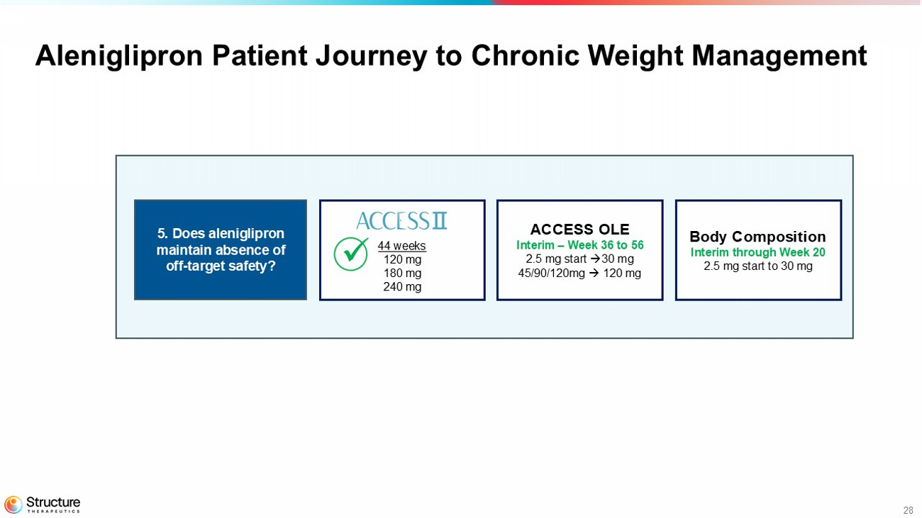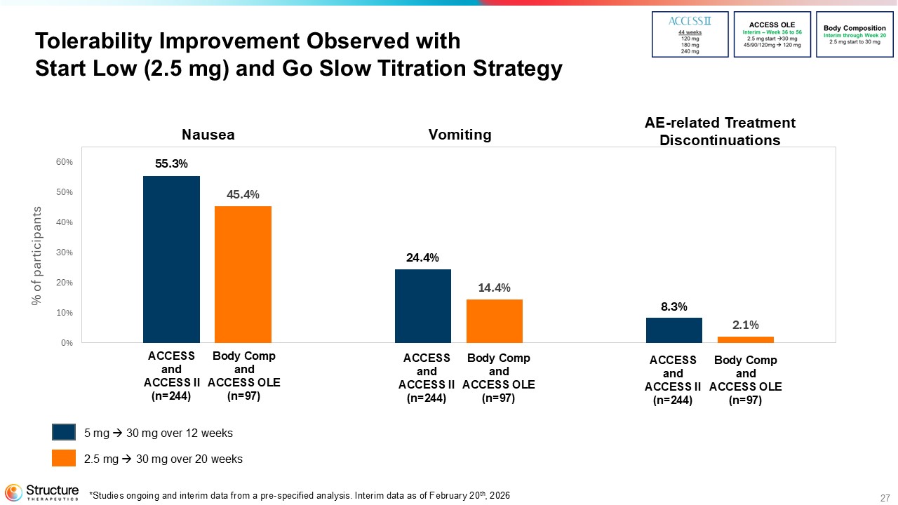 27 55.3% 24.4% 8.3% 45.4% 14.4% 2.1% 0% 10% 20% 30% 40% 50% 60% % of participants Tolerability Improvement Observed with Start Low (2.5 mg) and Go Slow Titration Strategy *Studies ongoing and interim data from a pre - specified analysis. Interim data as of February 20 th , 2026 Nausea Vomiting Discontinuations ACCESS and ACCESS II (n=244) Body Comp and ACCESS OLE (n=97) 5 mg 30 mg over 12 weeks 2.5 mg 30 mg over 20 weeks ACCESS and ACCESS II (n=244) Body Comp and ACCESS OLE (n=97) ACCESS and ACCESS II (n=244) Body Comp and ACCESS OLE (n=97)