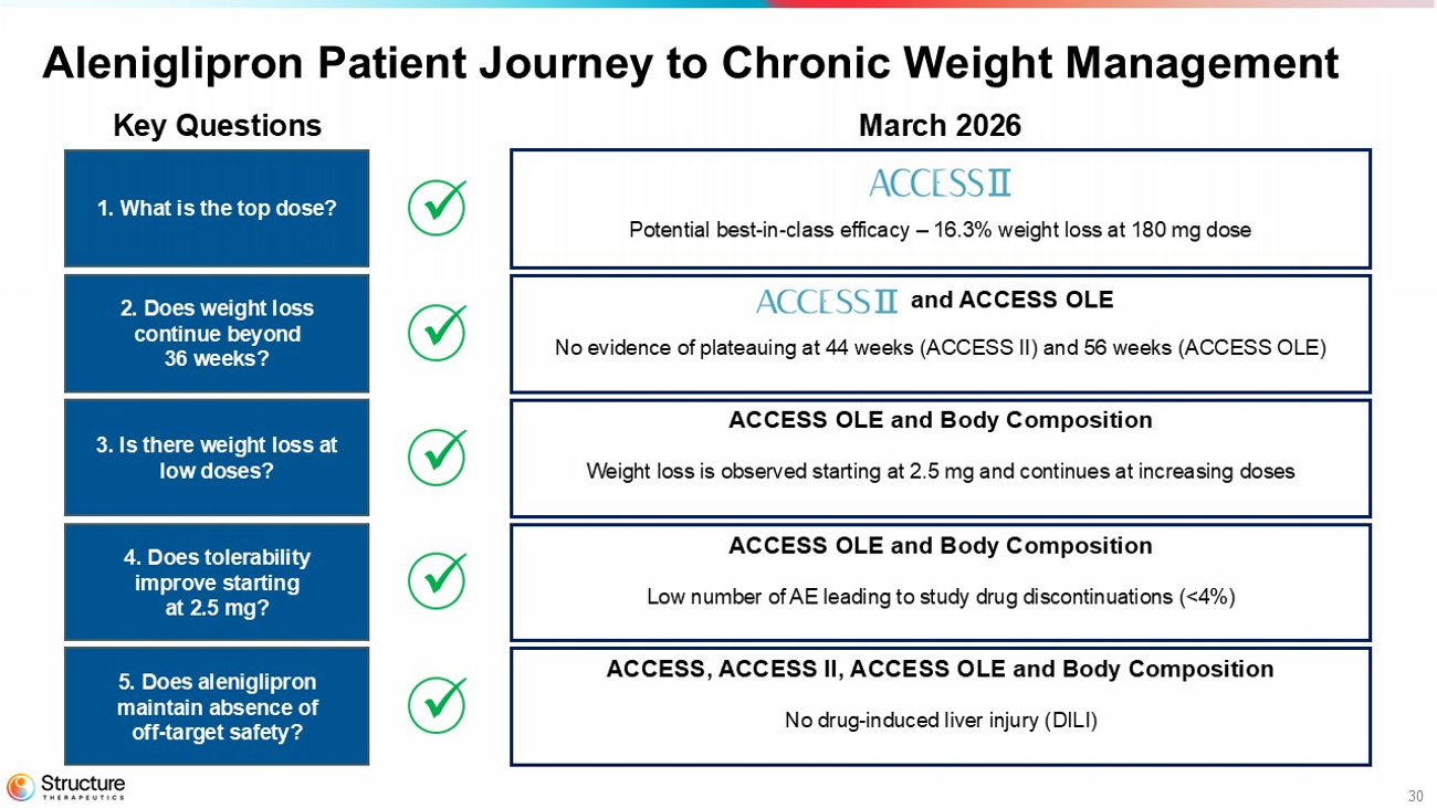 29 Aleniglipron Continues to Demonstrate Favorable Off - Target Safety Results • No cases of drug - induced liver injury (DILI) • No cases of ALT or AST ≥ 10x upper limit of normal (ULN) • All cases of elevated ALT and AST resolved without treatment modification or discontinuation * Interim data as of February 20th, 2026 Body Composition* Exploratory ACCESS II (up to 240 mg) ACCESS OLE * Phase 2b ACCESS (up to 120 mg) N (%) Placebo N=12 N=59 Placebo N=10 N=61 N=151 Placebo N=56 120 mg N=63 90 mg N=65 45 mg N=45 0 1 (1.8) 0 2 (3.3) 3 (2.0) 1 (1.8) 2 (3.2) 3 (4.8) 1 (2.3) ALT ≥ 3x ULN 0 0 0 0 2 (1.3) 0 0 1 (1.6) 0 ALT ≥ 5x ULN 0 0 0 0 0 0 0 0 0 ALT ≥ 10x ULN 0 1 (1.8) 0 2 (3.3) 1 (0.7) 1 (1.8) 0 0 0 AST ≥ 3x ULN 0 0 0 1 (1.7) 0 0 0 0 0 AST ≥ 5x ULN 0 0 0 0 0 0 0 0 0 AST ≥ 10x ULN 0 0 0 0 0 0 0 0 0 ALT or AST ≥ 3 x ULN and Total Bilirubin ≥ 2 x ULN
