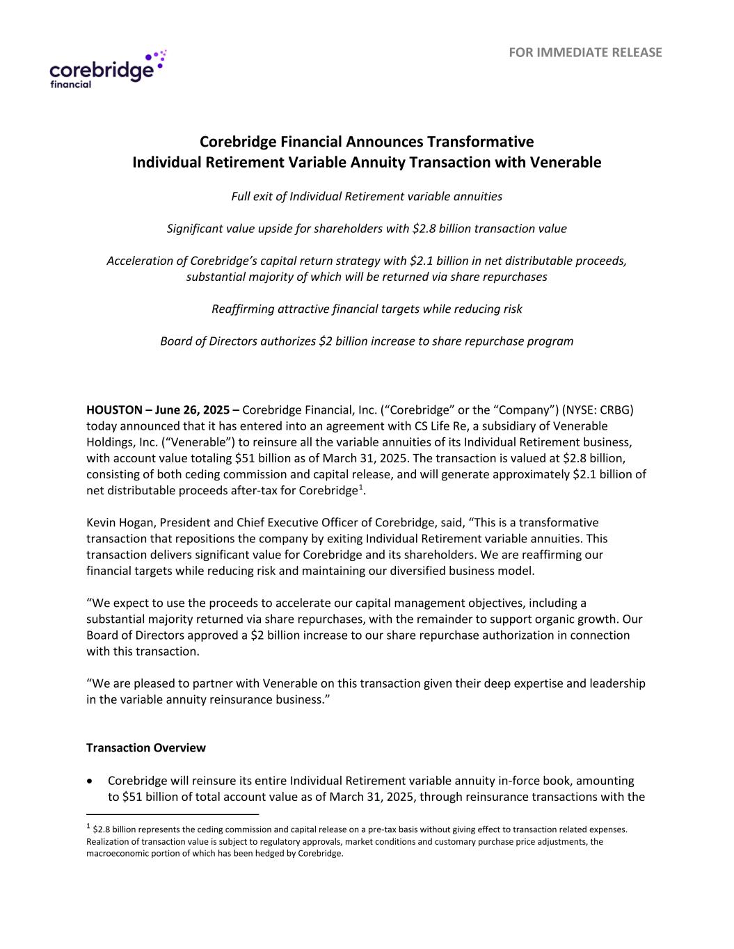 FOR IMMEDIATE RELEASE Corebridge Financial Announces Transformative Individual Retirement Variable Annuity Transaction with Venerable Full exit of Individual Retirement variable annuities Significant value upside for shareholders with $2.8 billion transaction value Acceleration of Corebridge’s capital return strategy with $2.1 billion in net distributable proceeds, substantial majority of which will be returned via share repurchases Reaffirming attractive financial targets while reducing risk Board of Directors authorizes $2 billion increase to share repurchase program HOUSTON – June 26, 2025 – Corebridge Financial, Inc. (“Corebridge” or the “Company”) (NYSE: CRBG) today announced that it has entered into an agreement with CS Life Re, a subsidiary of Venerable Holdings, Inc. (“Venerable”) to reinsure all the variable annuities of its Individual Retirement business, with account value totaling $51 billion as of March 31, 2025. The transaction is valued at $2.8 billion, consisting of both ceding commission and capital release, and will generate approximately $2.1 billion of net distributable proceeds after-tax for Corebridge1. Kevin Hogan, President and Chief Executive Officer of Corebridge, said, “This is a transformative transaction that repositions the company by exiting Individual Retirement variable annuities. This transaction delivers significant value for Corebridge and its shareholders. We are reaffirming our financial targets while reducing risk and maintaining our diversified business model. “We expect to use the proceeds to accelerate our capital management objectives, including a substantial majority returned via share repurchases, with the remainder to support organic growth. Our Board of Directors approved a $2 billion increase to our share repurchase authorization in connection with this transaction. “We are pleased to partner with Venerable on this transaction given their deep expertise and leadership in the variable annuity reinsurance business.” Transaction Overview • Corebridge will reinsure its entire Individual Retirement variable annuity in-force book, amounting to $51 billion of total account value as of March 31, 2025, through reinsurance transactions with the 1 $2.8 billion represents the ceding commission and capital release on a pre-tax basis without giving effect to transaction related expenses. Realization of transaction value is subject to regulatory approvals, market conditions and customary purchase price adjustments, the macroeconomic portion of which has been hedged by Corebridge.