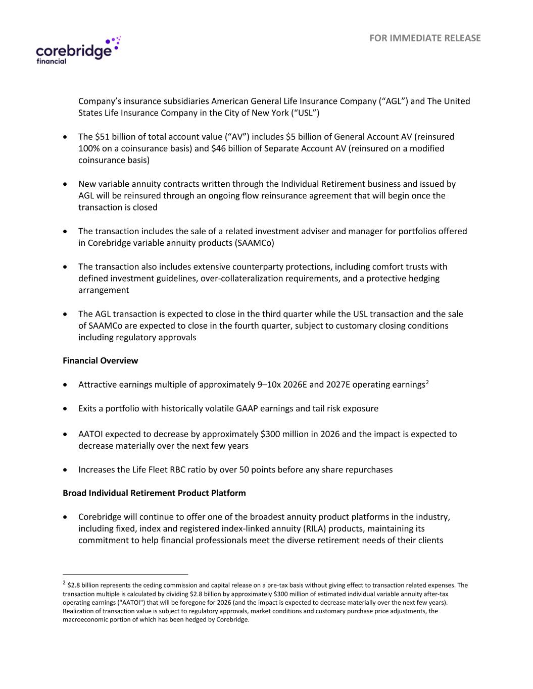 FOR IMMEDIATE RELEASE Company’s insurance subsidiaries American General Life Insurance Company (“AGL”) and The United States Life Insurance Company in the City of New York (“USL”) • The $51 billion of total account value (“AV”) includes $5 billion of General Account AV (reinsured 100% on a coinsurance basis) and $46 billion of Separate Account AV (reinsured on a modified coinsurance basis) • New variable annuity contracts written through the Individual Retirement business and issued by AGL will be reinsured through an ongoing flow reinsurance agreement that will begin once the transaction is closed • The transaction includes the sale of a related investment adviser and manager for portfolios offered in Corebridge variable annuity products (SAAMCo) • The transaction also includes extensive counterparty protections, including comfort trusts with defined investment guidelines, over-collateralization requirements, and a protective hedging arrangement • The AGL transaction is expected to close in the third quarter while the USL transaction and the sale of SAAMCo are expected to close in the fourth quarter, subject to customary closing conditions including regulatory approvals Financial Overview • Attractive earnings multiple of approximately 9–10x 2026E and 2027E operating earnings2 • Exits a portfolio with historically volatile GAAP earnings and tail risk exposure • AATOI expected to decrease by approximately $300 million in 2026 and the impact is expected to decrease materially over the next few years • Increases the Life Fleet RBC ratio by over 50 points before any share repurchases Broad Individual Retirement Product Platform • Corebridge will continue to offer one of the broadest annuity product platforms in the industry, including fixed, index and registered index-linked annuity (RILA) products, maintaining its commitment to help financial professionals meet the diverse retirement needs of their clients 2 $2.8 billion represents the ceding commission and capital release on a pre-tax basis without giving effect to transaction related expenses. The transaction multiple is calculated by dividing $2.8 billion by approximately $300 million of estimated individual variable annuity after-tax operating earnings ("AATOI") that will be foregone for 2026 (and the impact is expected to decrease materially over the next few years). Realization of transaction value is subject to regulatory approvals, market conditions and customary purchase price adjustments, the macroeconomic portion of which has been hedged by Corebridge.