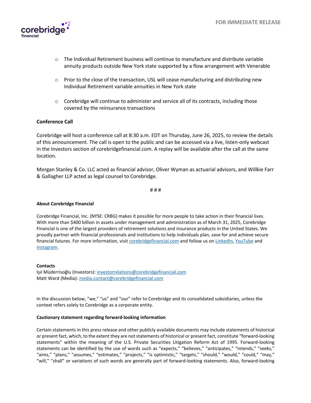 FOR IMMEDIATE RELEASE o The Individual Retirement business will continue to manufacture and distribute variable annuity products outside New York state supported by a flow arrangement with Venerable o Prior to the close of the transaction, USL will cease manufacturing and distributing new Individual Retirement variable annuities in New York state o Corebridge will continue to administer and service all of its contracts, including those covered by the reinsurance transactions Conference Call Corebridge will host a conference call at 8:30 a.m. EDT on Thursday, June 26, 2025, to review the details of this announcement. The call is open to the public and can be accessed via a live, listen-only webcast in the Investors section of corebridgefinancial.com. A replay will be available after the call at the same location. Morgan Stanley & Co. LLC acted as financial advisor, Oliver Wyman as actuarial advisors, and Willkie Farr & Gallagher LLP acted as legal counsel to Corebridge. # # # About Corebridge Financial Corebridge Financial, Inc. (NYSE: CRBG) makes it possible for more people to take action in their financial lives. With more than $400 billion in assets under management and administration as of March 31, 2025, Corebridge Financial is one of the largest providers of retirement solutions and insurance products in the United States. We proudly partner with financial professionals and institutions to help individuals plan, save for and achieve secure financial futures. For more information, visit corebridgefinancial.com and follow us on LinkedIn, YouTube and Instagram. Contacts Işıl Müderrisoğlu (Investors): investorrelations@corebridgefinancial.com Matt Ward (Media): media.contact@corebridgefinancial.com In the discussion below, “we,” “us” and “our” refer to Corebridge and its consolidated subsidiaries, unless the context refers solely to Corebridge as a corporate entity. Cautionary statement regarding forward-looking information Certain statements in this press release and other publicly available documents may include statements of historical or present fact, which, to the extent they are not statements of historical or present fact, constitute “forward-looking statements” within the meaning of the U.S. Private Securities Litigation Reform Act of 1995. Forward-looking statements can be identified by the use of words such as “expects,” “believes,” “anticipates,” “intends,” “seeks,” “aims,” “plans,” “assumes,” “estimates,” “projects,” “is optimistic,” “targets," “should,” “would,” “could,” “may,” “will,” “shall” or variations of such words are generally part of forward-looking statements. Also, forward-looking