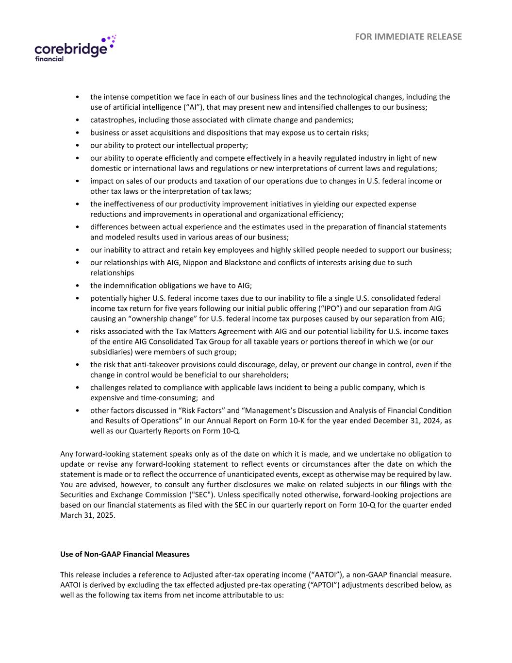 FOR IMMEDIATE RELEASE statements include, without limitation, all matters that are not historical facts. Forward-looking statements are made based on management’s current expectations and beliefs concerning future developments and their potential effects upon Corebridge. There can be no assurance that future developments affecting Corebridge will be those anticipated by management. Any forward-looking statements included herein are not a guarantee of future performance and involve risks and uncertainties, and there are certain important factors that could cause actual results to differ, possibly materially, from expectations or estimates reflected or implied in such forward-looking statements, including, among others, risks related to: • changes in interest rates and changes to credit spreads; • the deterioration of economic conditions, including an increase in the likelihood of an economic slowdown or recession, changes in market conditions, trade disputes with other countries, including the effect of sanctions and trade restrictions, such as tariffs and trade barriers imposed by the U.S. government and any countermeasures by other governments in response to such tariffs, weakening in capital markets in the U.S and globally, volatility in equity markets, inflationary pressures, the rise of pressures on the commercial real estate market, and geopolitical tensions, including the ongoing armed conflicts between Ukraine and Russia and in the Middle East; • the unpredictability of the amount and timing of insurance liability claims; • unavailable, uneconomical or inadequate reinsurance or recaptures of reinsured liabilities; • uncertainty and unpredictability related to our reinsurance agreements with Fortitude Reinsurance Company Ltd. (“Fortitude Re”) and its performance of its obligations under these agreements; • our limited ability to access funds from our subsidiaries; • our ability to incur indebtedness, our potential inability to refinance all or a portion of our indebtedness or our ability to obtain additional financing on favorable terms or at all; • our ability to maintain sufficient eligible collateral to support business and funding strategies requiring collateralization; • our inability to generate cash to meet our needs due to the illiquidity of some of our investments; • the inaccuracy of the methodologies, estimations and assumptions underlying our valuation of investments and derivatives; • a downgrade in our Insurer Financial Strength (“IFS”) ratings or credit ratings; • exposure to credit risk due to non-performance or defaults by our counterparties or our use of derivative instruments to hedge market risks associated with our liabilities; • our ability to adequately assess risks and estimate losses related to the pricing of our products; • the failure of third parties that we rely upon to provide and adequately perform certain business, operations, investment advisory, functional support and administrative services on our behalf; • the impact of risks associated with our arrangement with Blackstone ISG-I Advisors LLC (“Blackstone IM”), BlackRock Financial Management, Inc. (“BlackRock”) or any other asset manager we retain, including their historical performance not being indicative of the future results of our investment portfolio and the exclusivity of certain arrangements with Blackstone IM; • our inability to maintain the availability of critical technology systems and the confidentiality of our data, including challenges associated with a variety of privacy and information security laws; • the ineffectiveness of our risk management policies and procedures; • significant legal, governmental or regulatory proceedings;