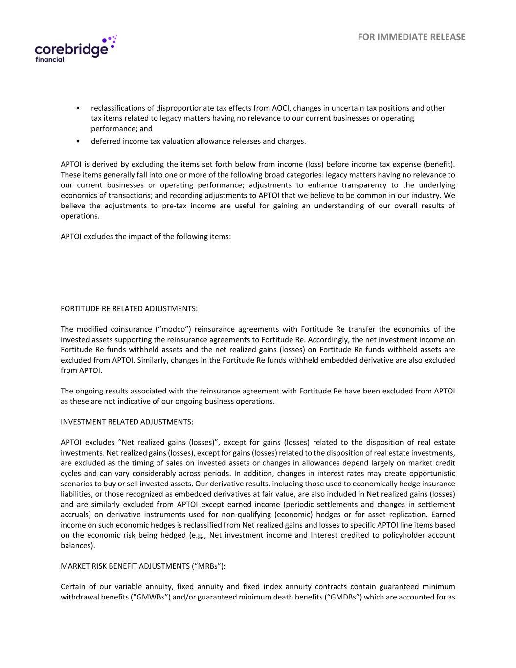 FOR IMMEDIATE RELEASE • reclassifications of disproportionate tax effects from AOCI, changes in uncertain tax positions and other tax items related to legacy matters having no relevance to our current businesses or operating performance; and • deferred income tax valuation allowance releases and charges. APTOI is derived by excluding the items set forth below from income (loss) before income tax expense (benefit). These items generally fall into one or more of the following broad categories: legacy matters having no relevance to our current businesses or operating performance; adjustments to enhance transparency to the underlying economics of transactions; and recording adjustments to APTOI that we believe to be common in our industry. We believe the adjustments to pre-tax income are useful for gaining an understanding of our overall results of operations. APTOI excludes the impact of the following items: FORTITUDE RE RELATED ADJUSTMENTS: The modified coinsurance (“modco”) reinsurance agreements with Fortitude Re transfer the economics of the invested assets supporting the reinsurance agreements to Fortitude Re. Accordingly, the net investment income on Fortitude Re funds withheld assets and the net realized gains (losses) on Fortitude Re funds withheld assets are excluded from APTOI. Similarly, changes in the Fortitude Re funds withheld embedded derivative are also excluded from APTOI. The ongoing results associated with the reinsurance agreement with Fortitude Re have been excluded from APTOI as these are not indicative of our ongoing business operations. INVESTMENT RELATED ADJUSTMENTS: APTOI excludes “Net realized gains (losses)”, except for gains (losses) related to the disposition of real estate investments. Net realized gains (losses), except for gains (losses) related to the disposition of real estate investments, are excluded as the timing of sales on invested assets or changes in allowances depend largely on market credit cycles and can vary considerably across periods. In addition, changes in interest rates may create opportunistic scenarios to buy or sell invested assets. Our derivative results, including those used to economically hedge insurance liabilities, or those recognized as embedded derivatives at fair value, are also included in Net realized gains (losses) and are similarly excluded from APTOI except earned income (periodic settlements and changes in settlement accruals) on derivative instruments used for non-qualifying (economic) hedges or for asset replication. Earned income on such economic hedges is reclassified from Net realized gains and losses to specific APTOI line items based on the economic risk being hedged (e.g., Net investment income and Interest credited to policyholder account balances). MARKET RISK BENEFIT ADJUSTMENTS (“MRBs”): Certain of our variable annuity, fixed annuity and fixed index annuity contracts contain guaranteed minimum withdrawal benefits (“GMWBs”) and/or guaranteed minimum death benefits (“GMDBs”) which are accounted for as