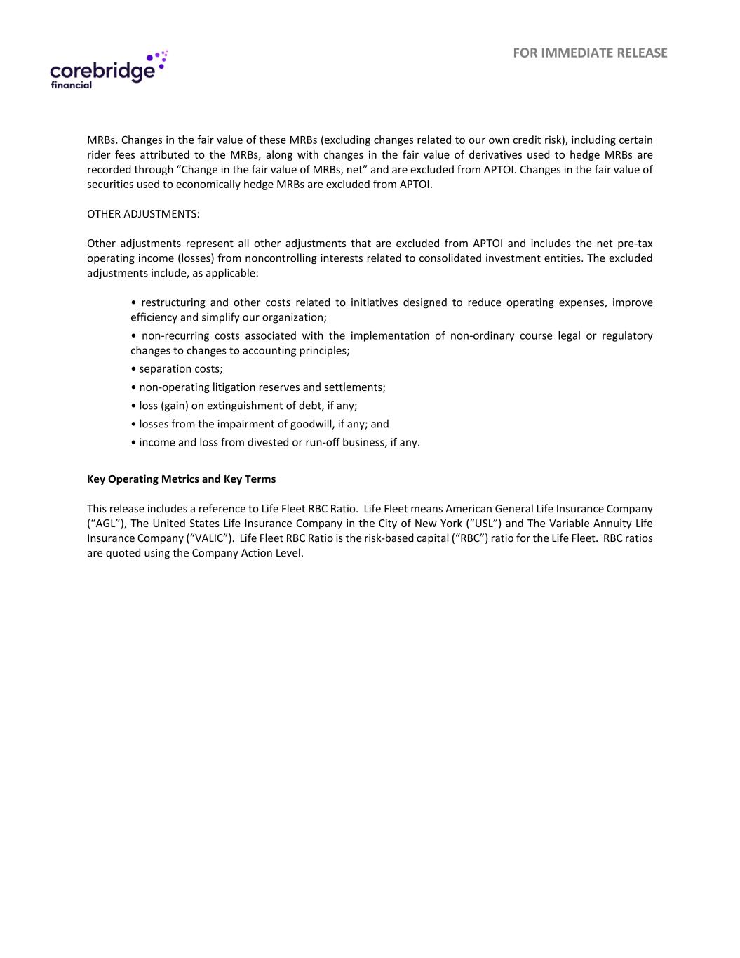 FOR IMMEDIATE RELEASE MRBs. Changes in the fair value of these MRBs (excluding changes related to our own credit risk), including certain rider fees attributed to the MRBs, along with changes in the fair value of derivatives used to hedge MRBs are recorded through “Change in the fair value of MRBs, net” and are excluded from APTOI. Changes in the fair value of securities used to economically hedge MRBs are excluded from APTOI. OTHER ADJUSTMENTS: Other adjustments represent all other adjustments that are excluded from APTOI and includes the net pre-tax operating income (losses) from noncontrolling interests related to consolidated investment entities. The excluded adjustments include, as applicable: • restructuring and other costs related to initiatives designed to reduce operating expenses, improve efficiency and simplify our organization; • non-recurring costs associated with the implementation of non-ordinary course legal or regulatory changes to changes to accounting principles; • separation costs; • non-operating litigation reserves and settlements; • loss (gain) on extinguishment of debt, if any; • losses from the impairment of goodwill, if any; and • income and loss from divested or run-off business, if any. Key Operating Metrics and Key Terms This release includes a reference to Life Fleet RBC Ratio. Life Fleet means American General Life Insurance Company (“AGL”), The United States Life Insurance Company in the City of New York (“USL”) and The Variable Annuity Life Insurance Company (“VALIC”). Life Fleet RBC Ratio is the risk-based capital (“RBC”) ratio for the Life Fleet. RBC ratios are quoted using the Company Action Level.