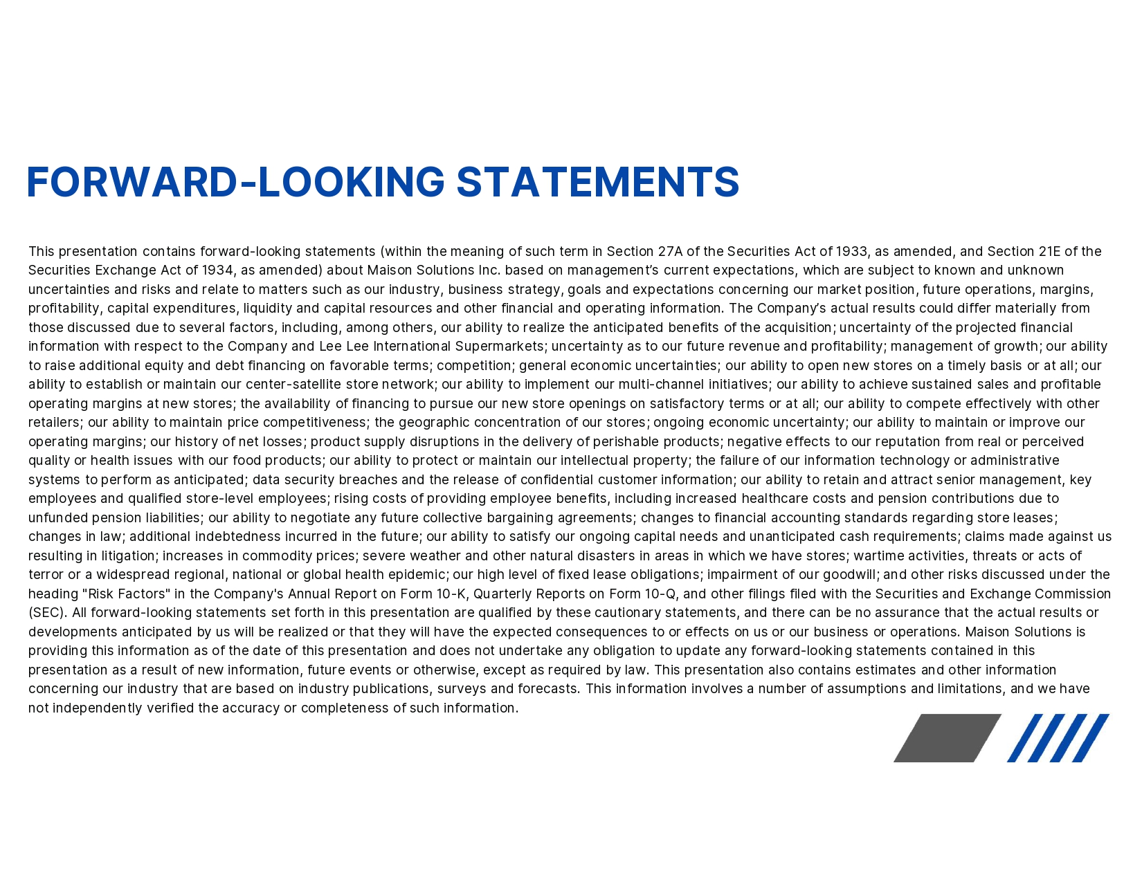 FORWARD - LOOKING STATEMENTS This presentation contains forward - looking statements (within the meaning of such term in Section 27A of the Securities Act of 1 933, as amended, and Section 21E of the Securities Exchange Act of 1934, as amended) about Maison Solutions Inc. based on management’s current expectations, which ar e s ubject to known and unknown uncertainties and risks and relate to matters such as our industry, business strategy, goals and expectations concerning our mar ket position, future operations, margins, profitability, capital expenditures, liquidity and capital resources and other financial and operating information. The Compa ny’ s actual results could differ materially from those discussed due to several factors, including, among others, our ability to realize the anticipated benefits of the acqui sit ion; uncertainty of the projected financial information with respect to the Company and Lee Lee International Supermarkets; uncertainty as to our future revenue and profitability; management of growth; our ability to raise additional equity and debt financing on favorable terms; competition; general economic uncertainties; our ability to op en new stores on a timely basis or at all; our ability to establish or maintain our center - satellite store network; our ability to implement our multi - channel initiatives; our ability to achieve sustained sales and profitable operating margins at new stores; the availability of financing to pursue our new store openings on satisfactory terms or at a ll; our ability to compete effectively with other retailers; our ability to maintain price competitiveness; the geographic concentration of our stores; ongoing economic uncert ain ty; our ability to maintain or improve our operating margins; our history of net losses; product supply disruptions in the delivery of perishable products; negative eff ect s to our reputation from real or perceived quality or health issues with our food products; our ability to protect or maintain our intellectual property; the failure of ou r information technology or administrative systems to perform as anticipated; data security breaches and the release of confidential customer information; our ability t o r etain and attract senior management, key employees and qualified store - level employees; rising costs of providing employee benefits, including increased healthcare costs and pension contributions due to unfunded pension liabilities; our ability to negotiate any future collective bargaining agreements; changes to financial acco unt ing standards regarding store leases; changes in law; additional indebtedness incurred in the future; our ability to satisfy our ongoing capital needs and unantici pat ed cash requirements; claims made against us resulting in litigation; increases in commodity prices; severe weather and other natural disasters in areas in which we have sto res; wartime activities, threats or acts of terror or a widespread regional, national or global health epidemic; our high level of fixed lease obligations; impairment of ou r goodwill; and other risks discussed under the heading "Risk Factors" in the Company's Annual Report on Form 10 - K, Quarterly Reports on Form 10 - Q, and other filings filed with the Securities and Exchange Commission (SEC). All forward - looking statements set forth in this presentation are qualified by these cautionary statements, and there can be no assurance that the actual results or developments anticipated by us will be realized or that they will have the expected consequences to or effects on us or our b usi ness or operations. Maison Solutions is providing this information as of the date of this presentation and does not undertake any obligation to update any forward - looki ng statements contained in this presentation as a result of new information, future events or otherwise, except as required by law. This presentation also co nta ins estimates and other information concerning our industry that are based on industry publications, surveys and forecasts. This information involves a number of as sumptions and limitations, and we have not independently verified the accuracy or completeness of such information.