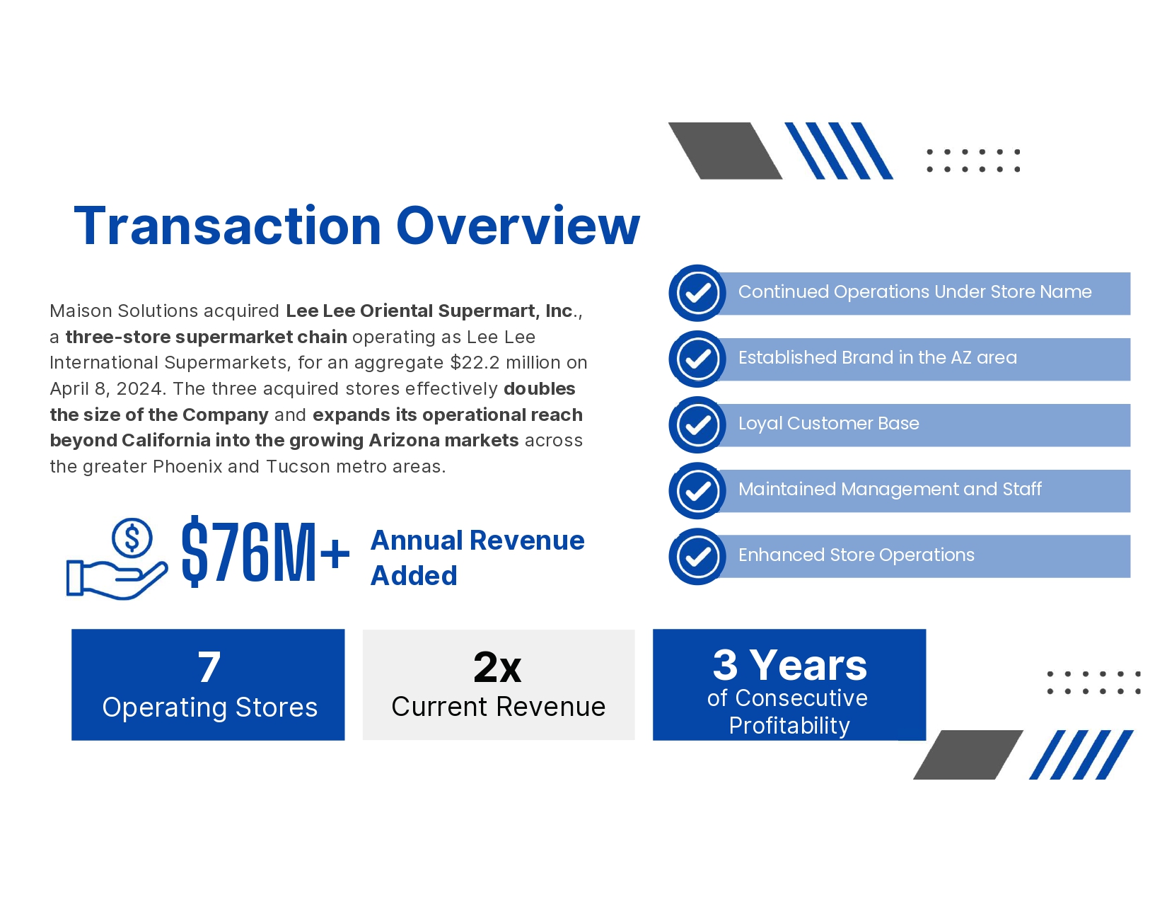 $76M+ Maison Solutions acquired Lee Lee Oriental Supermart, Inc ., a three - store supermarket chain operating as Lee Lee International Supermarkets, for an aggregate $22.2 million on April 8, 2024. The three acquired stores effectively doubles the size of the Company and expands its operational reach beyond California into the growing Arizona markets across the greater Phoenix and Tucson metro areas. Transaction Overview 7 2x Annual Revenue Added Operating Stores Current Revenue 3 Years of Consecutive Continued Operations Under Store Name Established Brand in the AZ area Loyal Customer Base Maintained Management and Staff Enhanced Store Operations Profitability