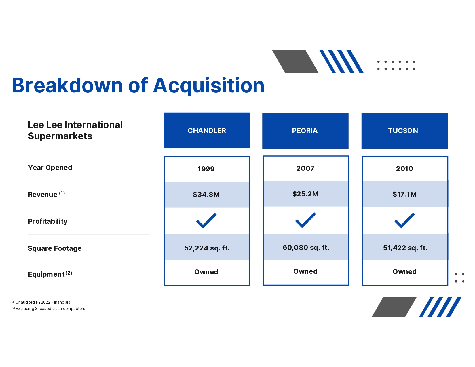 1999 $34.8M CHANDLER PEORIA TUCSON 52,224 sq. ft. Owned Year Opened Revenue (1) Profitability Square Footage Lee Lee International Supermarkets Equipment (2) 2007 $25.2M 60,080 sq. ft. Owned 2010 $17.1M 51,422 sq. ft. Owned Breakdown of Acquisition (1) Unaudited FY2022 Financials (2) Excluding 3 leased trash compactors