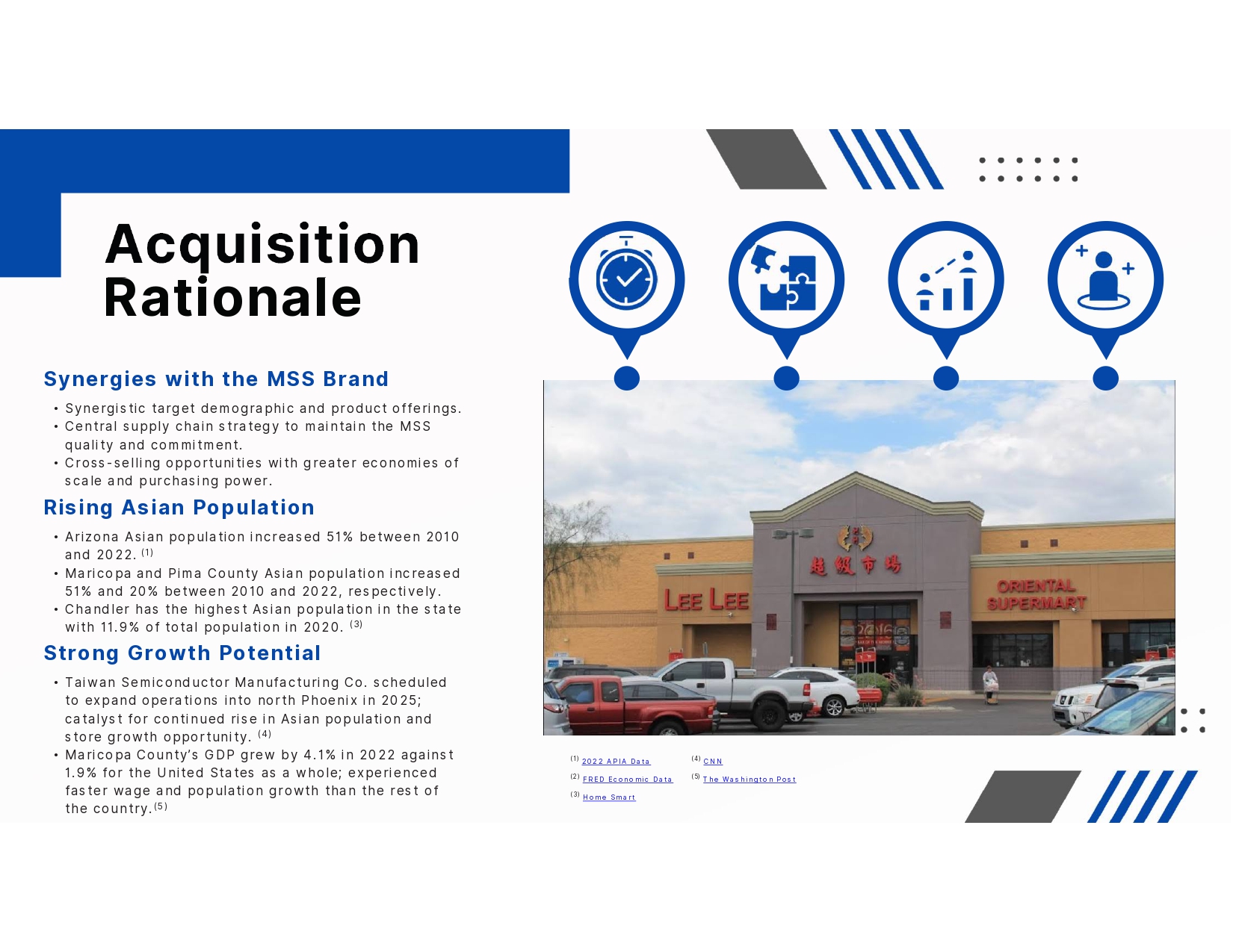 Acquisition Rationale • Arizona Asian population increased 51% between 2010 and 2022. (1) • Maricopa and Pima County Asian population increased 51% and 20% between 2010 and 2022, respectively. • Chandler has the highest Asian population in the state with 11.9% of total population in 2020. (3) Rising Asian Population • Synergistic target demographic and product offerings. • Central supply chain strategy to maintain the MSS quality and commitment. • Cross - selling opportunities with greater economies of scale and purchasing power. Synergies with the MSS Brand • Taiwan Semiconductor Manufacturing Co. scheduled to expand operations into north Phoenix in 2025; catalyst for continued rise in Asian population and store growth opportunity. (4) • Maricopa County’s GDP grew by 4.1% in 2022 against 1.9% for the United States as a whole; experienced faster wage and population growth than the rest of the country. (5) Strong Growth Potential (1) 2022 APIA Data (2) FRED Economic Data (3) Home Smart (4) CNN (5) The Washington Post