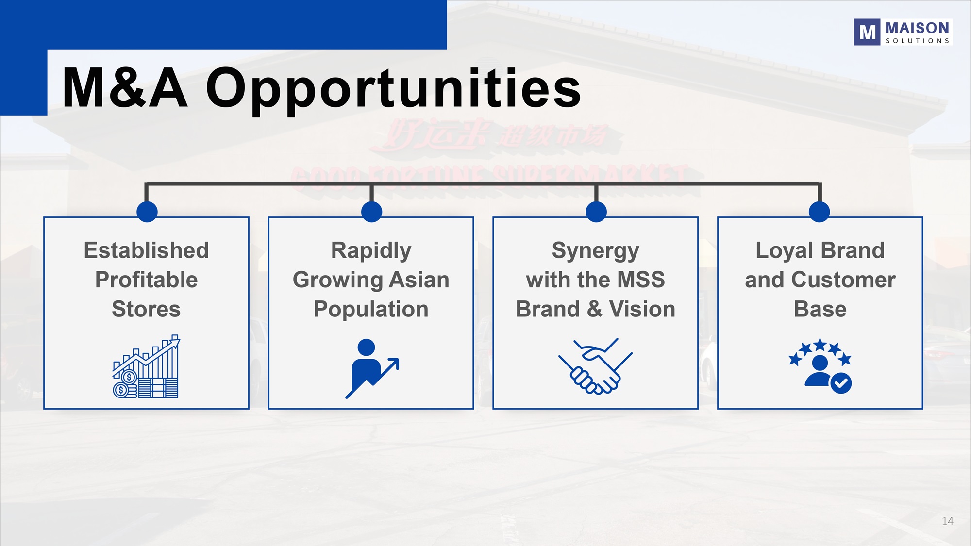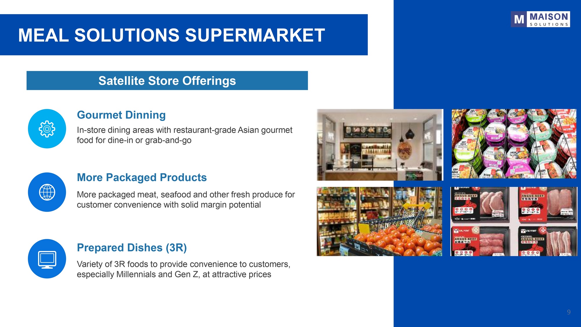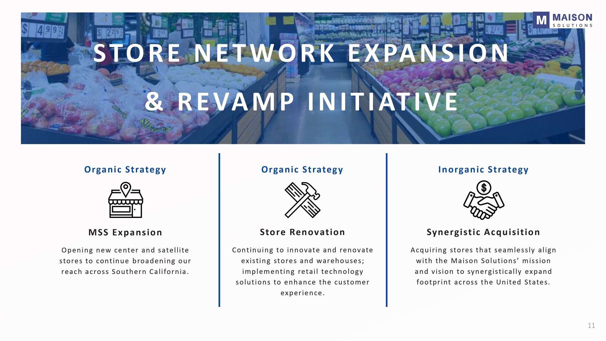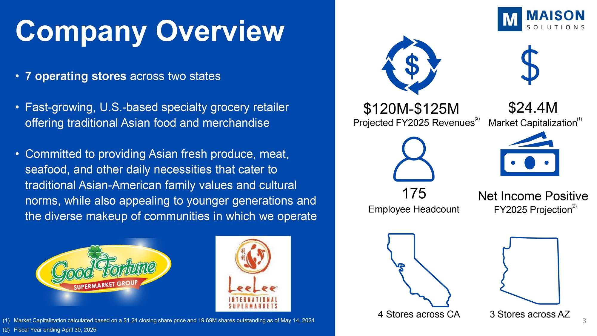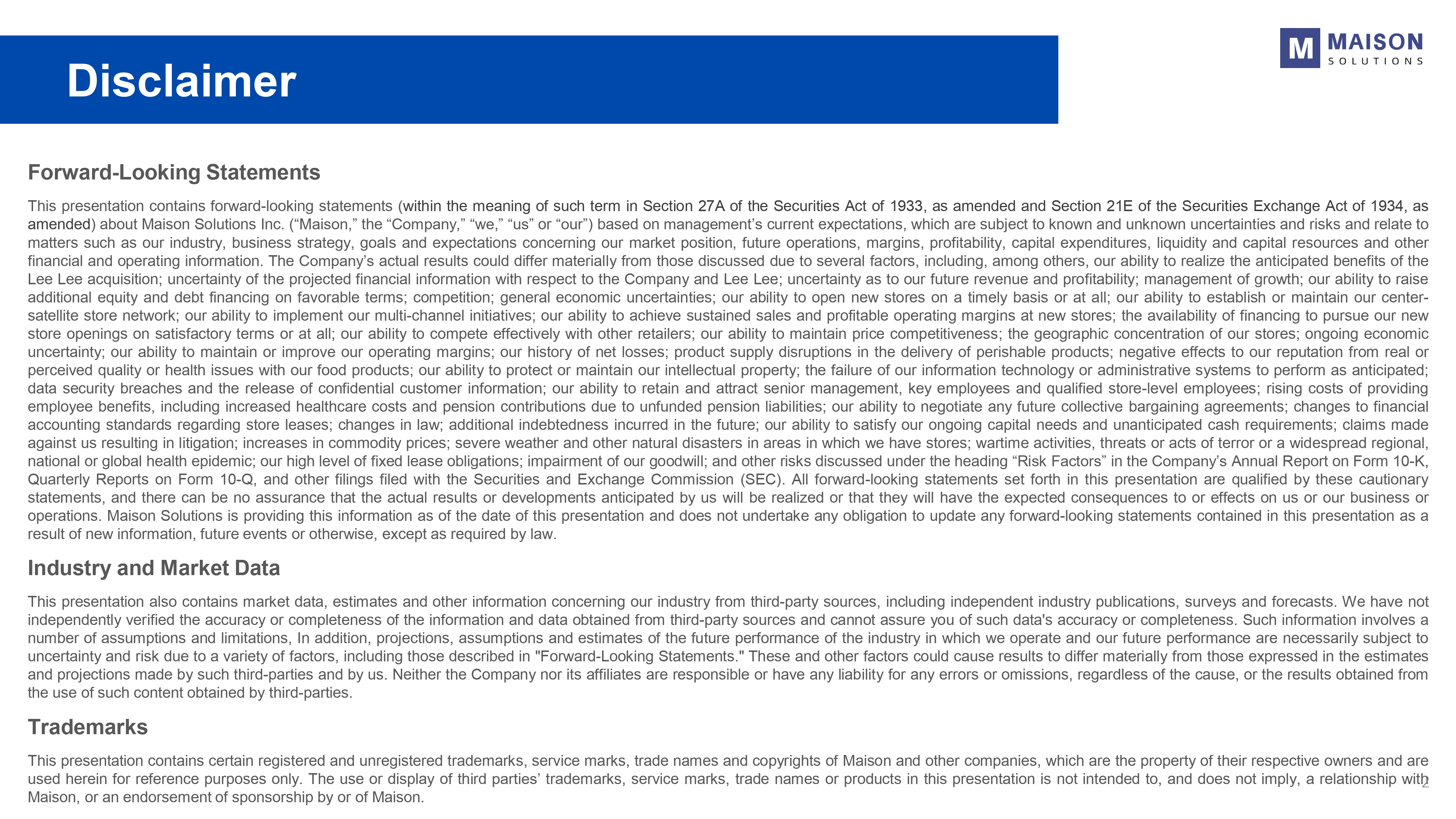 Forward - Looking Statements This presentation contains forward - looking statements ( within the meaning of such term in Section 27 A of the Securities Act of 1933 , as amended and Section 21 E of the Securities Exchange Act of 1934 , as amended ) about Maison Solutions Inc . (“Maison,” the “Company,” “we,” “us” or “our”) based on management’s current expectations, which are subject to known and unknown uncertainties and risks and relate to matters such as our industry, business strategy, goals and expectations concerning our market position, future operations, margins, profitability, capital expenditures, liquidity and capital resources and other financial and operating information . The Company’s actual results could differ materially from those discussed due to several factors, including, among others, our ability to realize the anticipated benefits of the Lee Lee acquisition ; uncertainty of the projected financial information with respect to the Company and Lee Lee ; uncertainty as to our future revenue and profitability ; management of growth ; our ability to raise additional equity and debt financing on favorable terms ; competition ; general economic uncertainties ; our ability to open new stores on a timely basis or at all ; our ability to establish or maintain our center - satellite store network ; our ability to implement our multi - channel initiatives ; our ability to achieve sustained sales and profitable operating margins at new stores ; the availability of financing to pursue our new store openings on satisfactory terms or at all ; our ability to compete effectively with other retailers ; our ability to maintain price competitiveness ; the geographic concentration of our stores ; ongoing economic uncertainty ; our ability to maintain or improve our operating margins ; our history of net losses ; product supply disruptions in the delivery of perishable products ; negative effects to our reputation from real or perceived quality or health issues with our food products ; our ability to protect or maintain our intellectual property ; the failure of our information technology or administrative systems to perform as anticipated ; data security breaches and the release of confidential customer information ; our ability to retain and attract senior management, key employees and qualified store - level employees ; rising costs of providing employee benefits, including increased healthcare costs and pension contributions due to unfunded pension liabilities ; our ability to negotiate any future collective bargaining agreements ; changes to financial accounting standards regarding store leases ; changes in law ; additional indebtedness incurred in the future ; our ability to satisfy our ongoing capital needs and unanticipated cash requirements ; claims made against us resulting in litigation ; increases in commodity prices ; severe weather and other natural disasters in areas in which we have stores ; wartime activities, threats or acts of terror or a widespread regional, national or global health epidemic ; our high level of fixed lease obligations ; impairment of our goodwill ; and other risks discussed under the heading “Risk Factors” in the Company’s Annual Report on Form 10 - K, Quarterly Reports on Form 10 - Q, and other filings filed with the Securities and Exchange Commission (SEC) . All forward - looking statements set forth in this presentation are qualified by these cautionary statements, and there can be no assurance that the actual results or developments anticipated by us will be realized or that they will have the expected consequences to or effects on us or our business or operations . Maison Solutions is providing this information as of the date of this presentation and does not undertake any obligation to update any forward - looking statements contained in this presentation as a result of new information, future events or otherwise, except as required by law . Industry and Market Data This presentation also contains market data, estimates and other information concerning our industry from third - party sources, including independent industry publications, surveys and forecasts . We have not independently verified the accuracy or completeness of the information and data obtained from third - party sources and cannot assure you of such data's accuracy or completeness . Such information involves a number of assumptions and limitations, In addition, projections, assumptions and estimates of the future performance of the industry in which we operate and our future performance are necessarily subject to uncertainty and risk due to a variety of factors, including those described in "Forward - Looking Statements . " These and other factors could cause results to differ materially from those expressed in the estimates and projections made by such third - parties and by us . Neither the Company nor its affiliates are responsible or have any liability for any errors or omissions, regardless of the cause, or the results obtained from the use of such content obtained by third - parties . Trademarks This presentation contains certain registered and unregistered trademarks, service marks, trade names and copyrights of Maison and other companies, which are the property of their respective owners and are used herein for reference purposes only . The use or display of third parties’ trademarks, service marks, trade names or products in this presentation is not intended to, and does not imply, a relationship with Maison, or an endorsement of sponsorship by or of Maison . Disclaimer 2